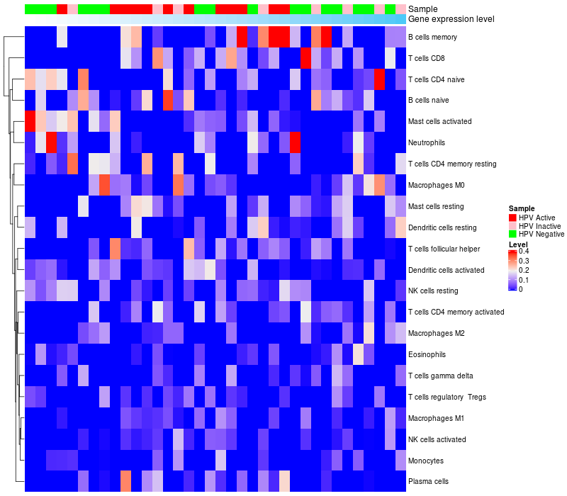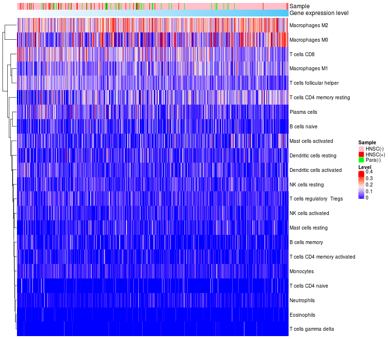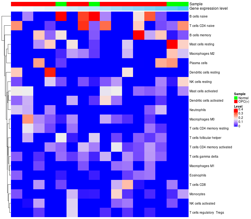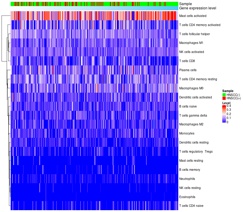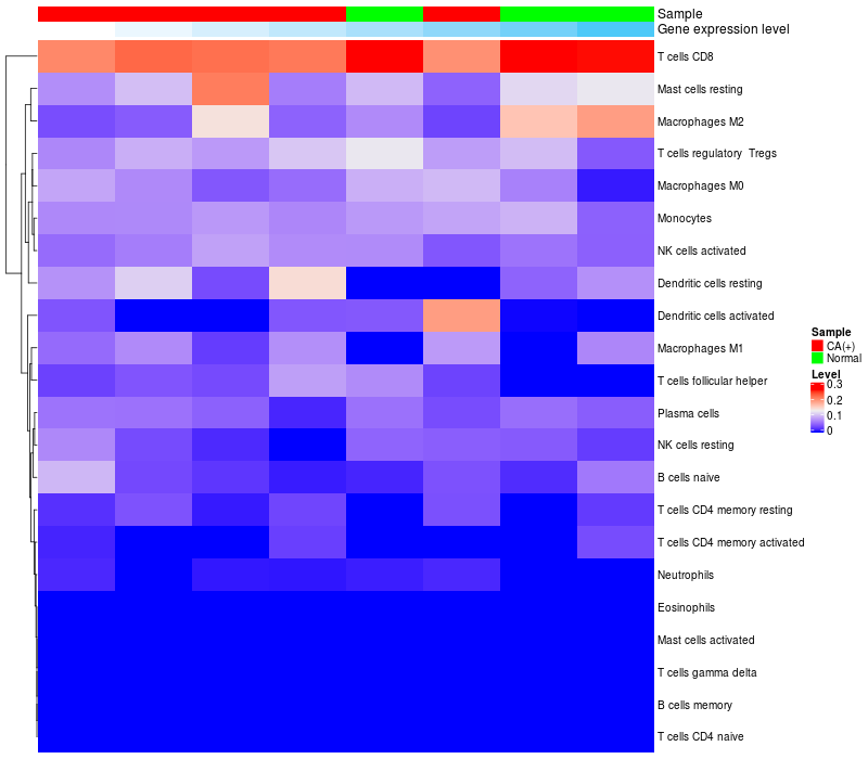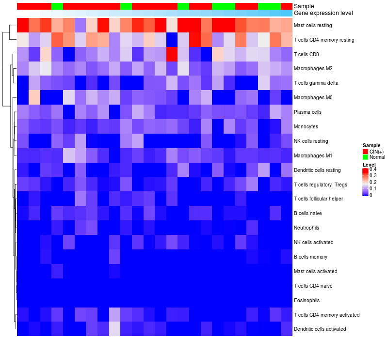 • Left: Heatmap of target gene expression and the level of various types of immune cells (cell type fractions) in all samples based on CIBERSORT method.