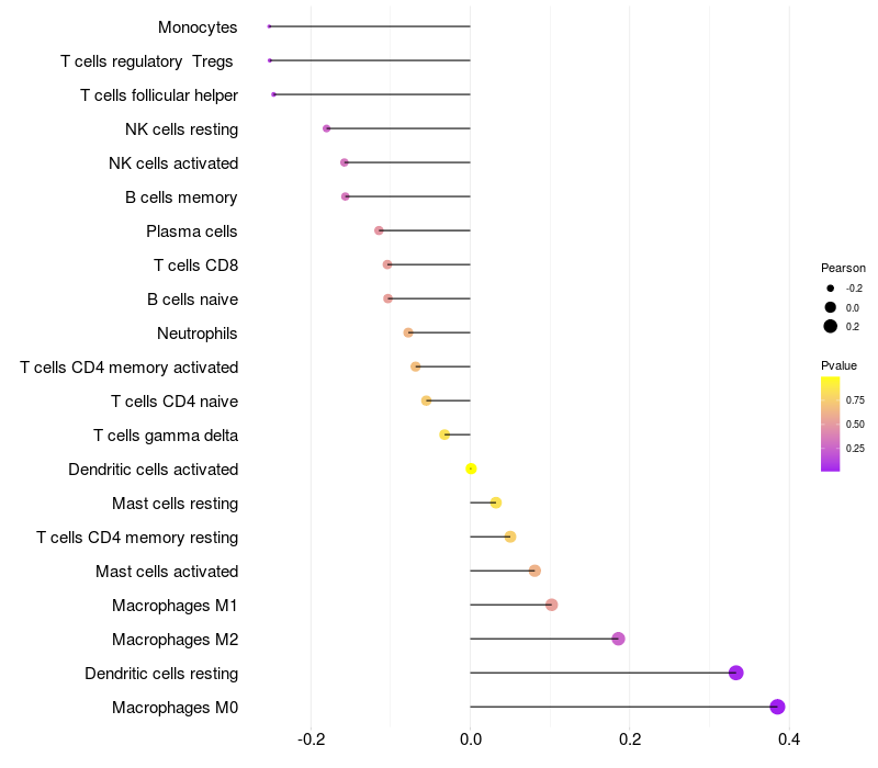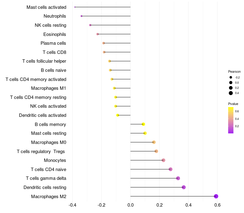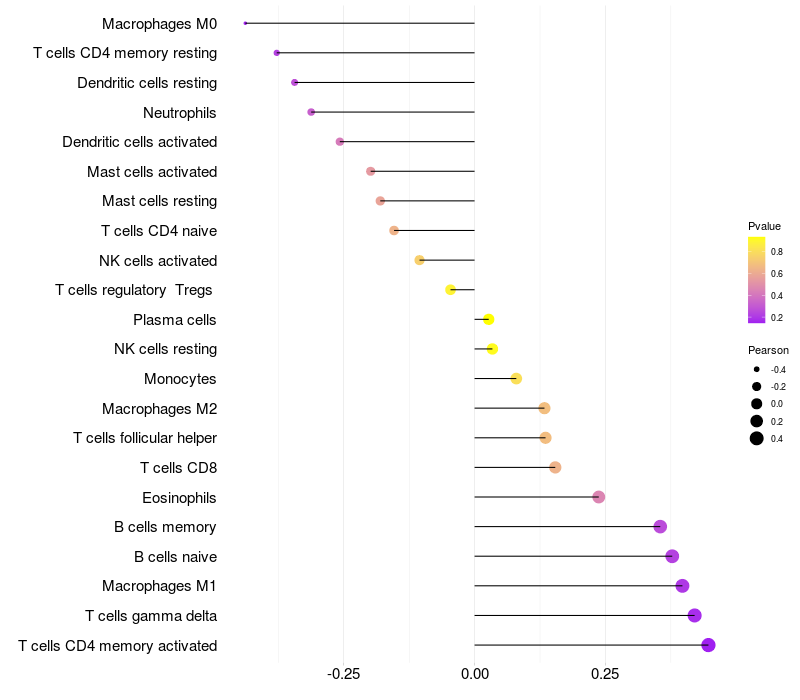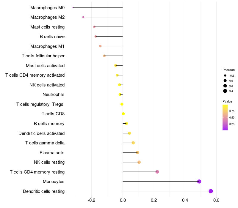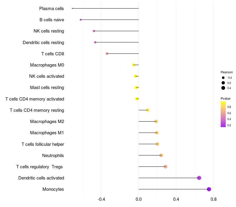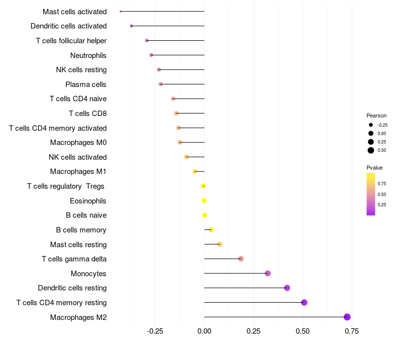 • Right: Correlation of target gene expression and the level of various types of immune cells in virus positive samples (Pearson Correlation Coefficient).