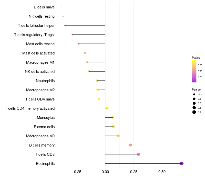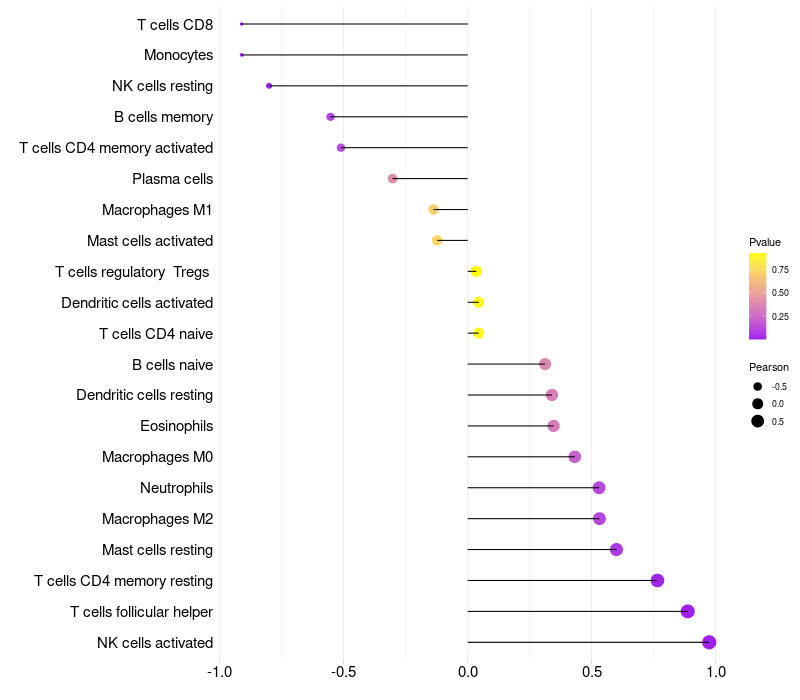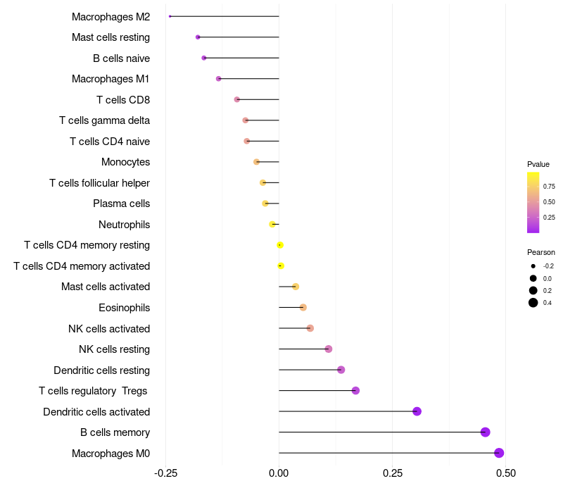 Lollipop of TM4SF1 expression and immune infiltrating cell level correlation result in HBV+ Chronic HBV (CHB) infection samples