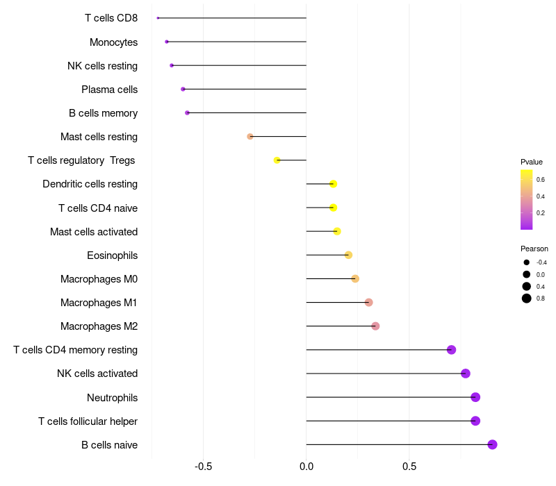 Lollipop of TM4SF1 expression and immune infiltrating cell level correlation result in HBV+ Liver cirrhosis samples