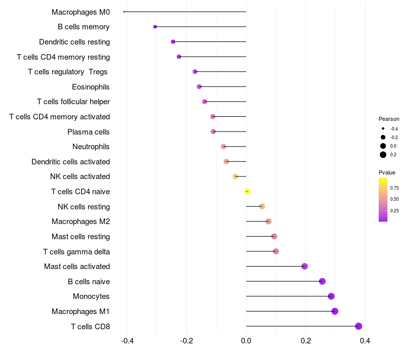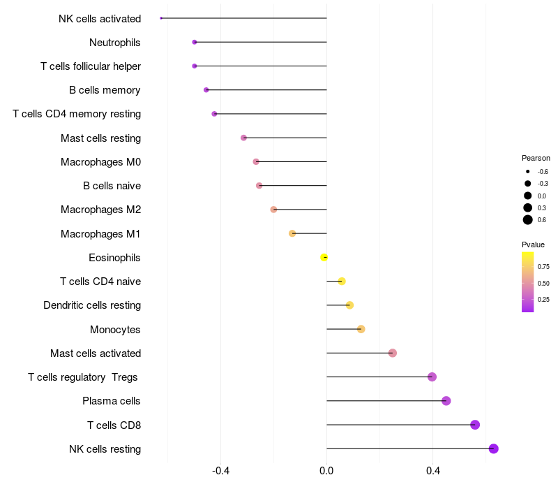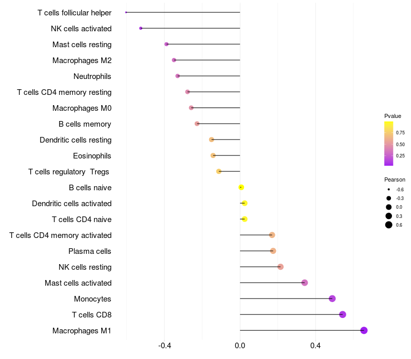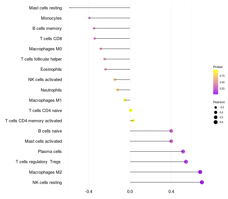 Lollipop of TM6SF2 expression and immune infiltrating cell level correlation result in HBV+ Liver cirrhosis samples