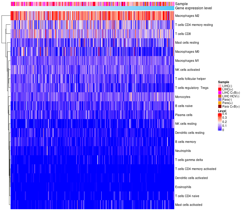 Liver hepatocellular carcinoma HCV (HBV+)(86), Liver hepatocellular carcinoma HCV (HBV-)(19), Liver hepatocellular carcinoma (HBV+)(209), Liver hepatocellular carcinoma (HBV+)(60), Paracancerous HCV (HBV+)(4), Paracancerous (HBV-)(28), Paracancerous (HBV+)(18) |