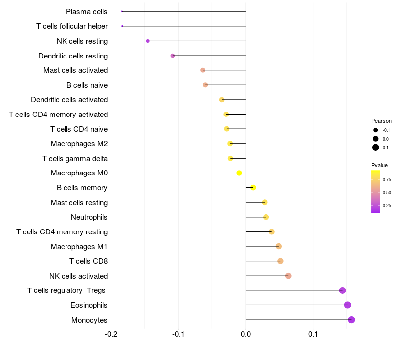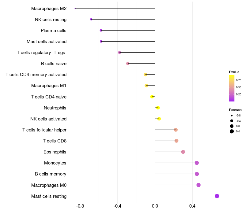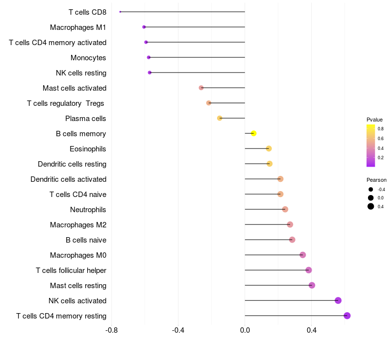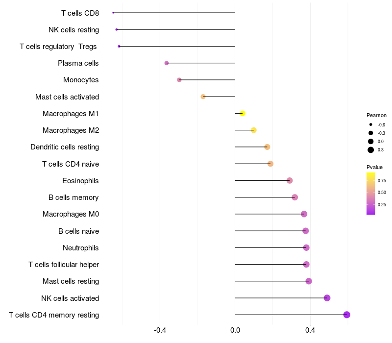 Lollipop of TM7SF3 expression and immune infiltrating cell level correlation result in HBV+ Liver cirrhosis samples
