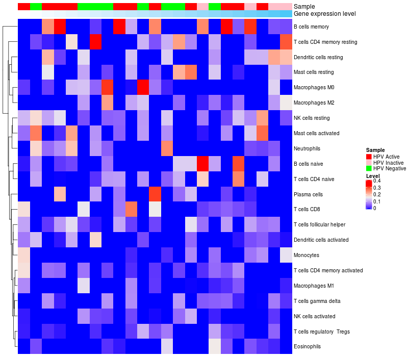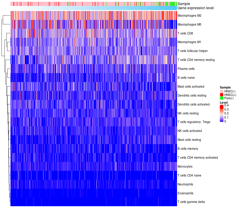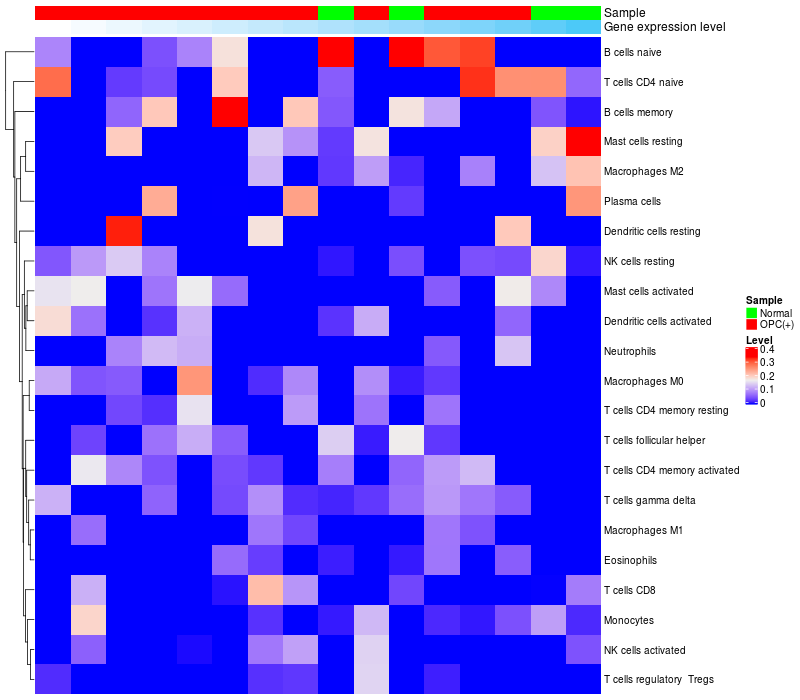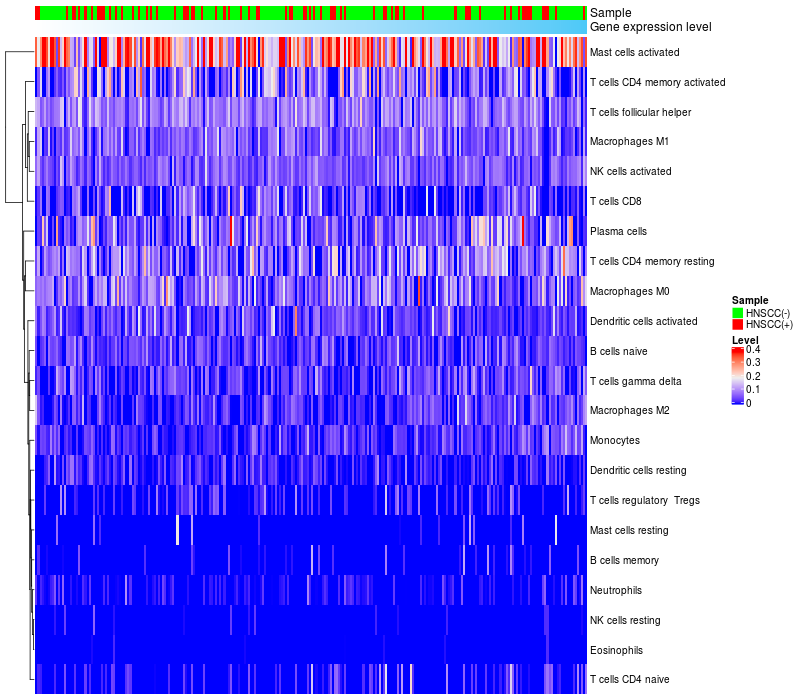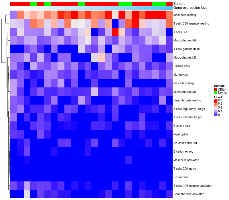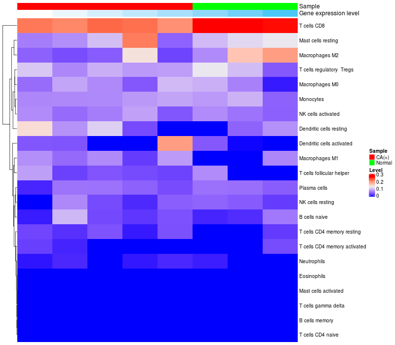 • Left: Heatmap of target gene expression and the level of various types of immune cells (cell type fractions) in all samples based on CIBERSORT method.