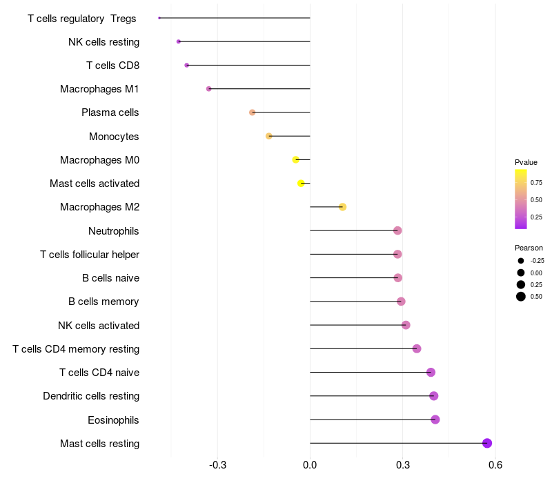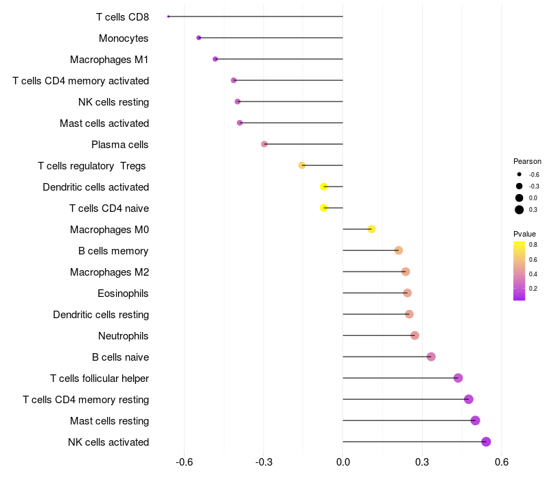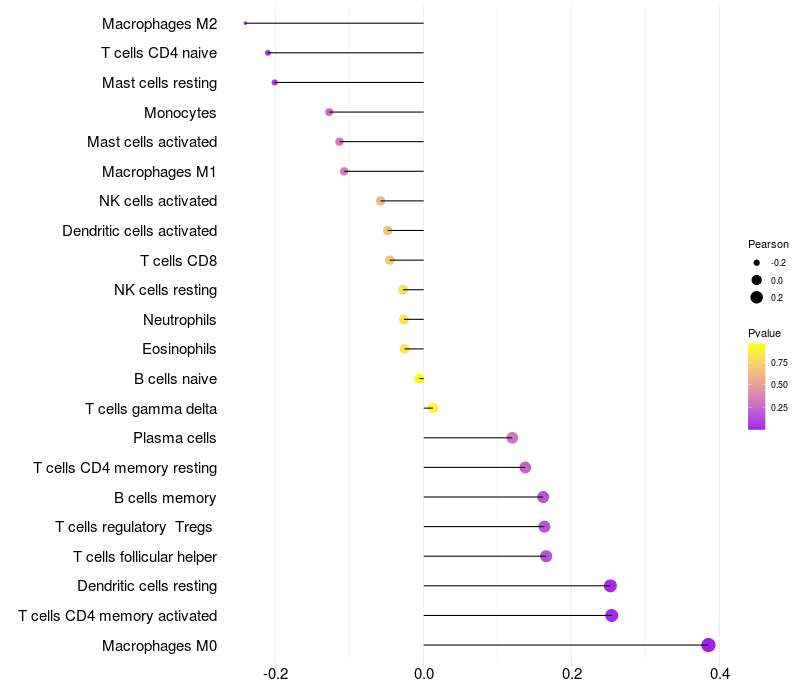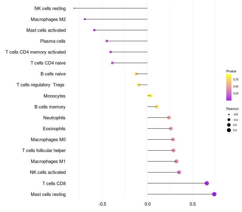 Lollipop of TMEM107 expression and immune infiltrating cell level correlation result in HBV+ Liver cirrhosis samples