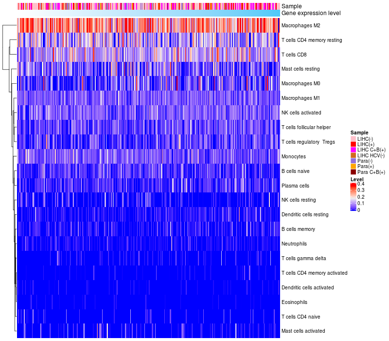 Liver hepatocellular carcinoma HCV (HBV+)(86), Liver hepatocellular carcinoma HCV (HBV-)(19), Liver hepatocellular carcinoma (HBV+)(209), Liver hepatocellular carcinoma (HBV+)(60), Paracancerous HCV (HBV+)(4), Paracancerous (HBV-)(28), Paracancerous (HBV+)(18) |