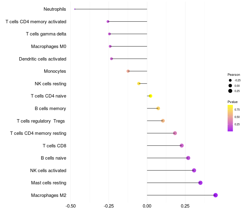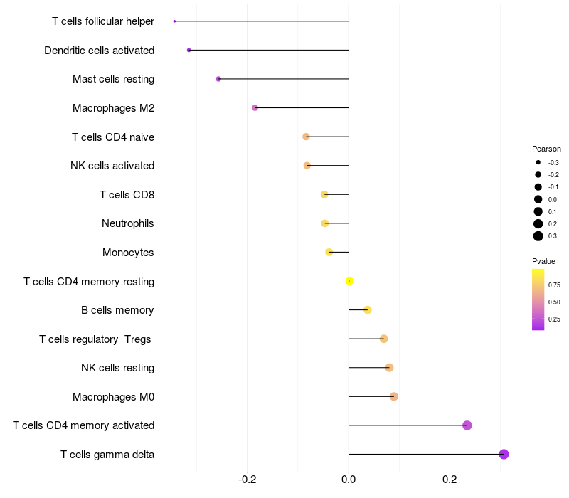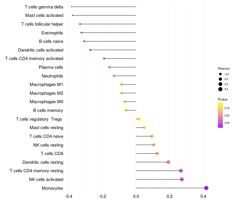 Lollipop of TMEM108 expression and immune infiltrating cell level correlation result in HTLV1+ samples