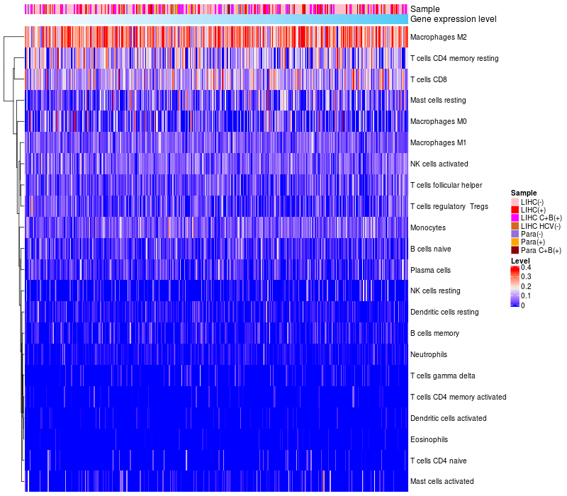 Liver hepatocellular carcinoma HCV (HBV+)(86), Liver hepatocellular carcinoma HCV (HBV-)(19), Liver hepatocellular carcinoma (HBV+)(209), Liver hepatocellular carcinoma (HBV+)(60), Paracancerous HCV (HBV+)(4), Paracancerous (HBV-)(28), Paracancerous (HBV+)(18) |