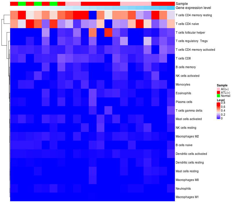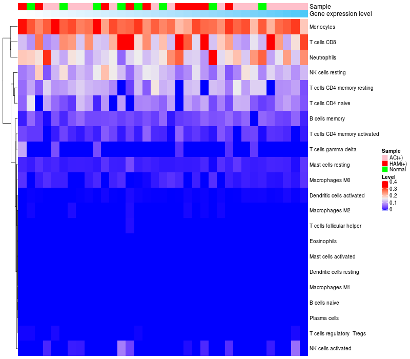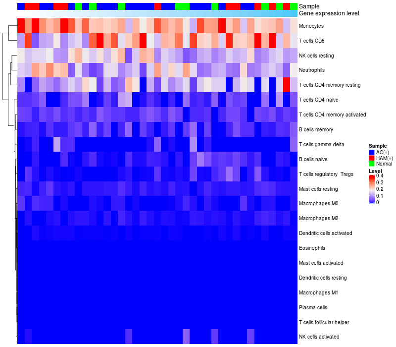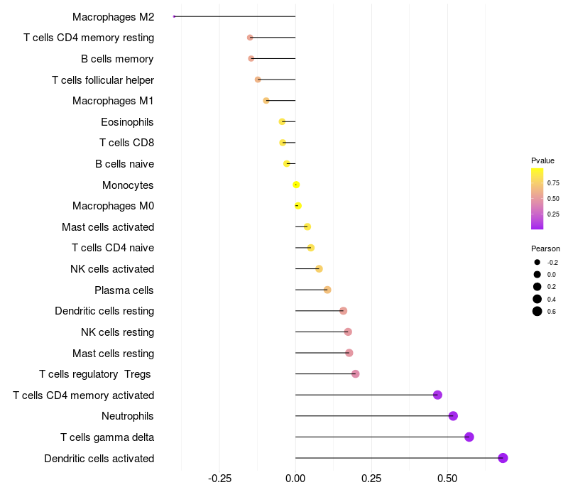 Lollipop of TMEM123 expression and immune infiltrating cell level correlation result in HTLV1+ samples