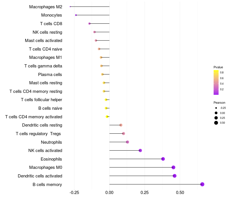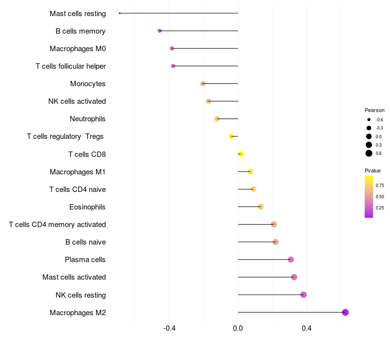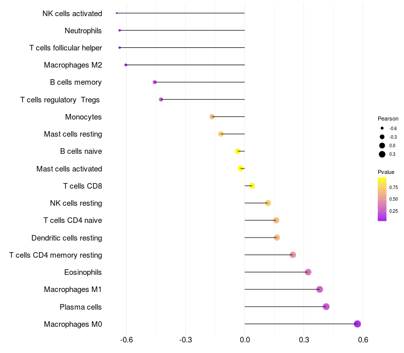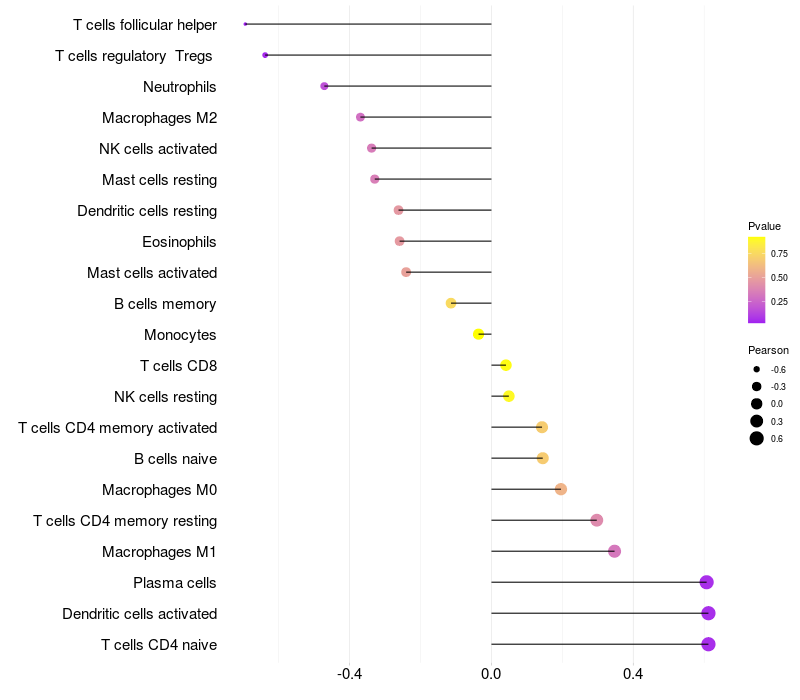 Lollipop of TMEM130 expression and immune infiltrating cell level correlation result in HBV+ Liver cirrhosis samples