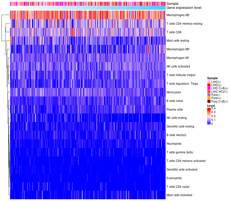 Liver hepatocellular carcinoma HCV (HBV+)(86), Liver hepatocellular carcinoma HCV (HBV-)(19), Liver hepatocellular carcinoma (HBV+)(209), Liver hepatocellular carcinoma (HBV+)(60), Paracancerous HCV (HBV+)(4), Paracancerous (HBV-)(28), Paracancerous (HBV+)(18) |