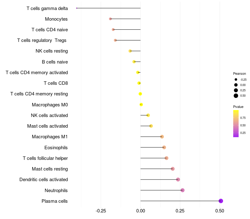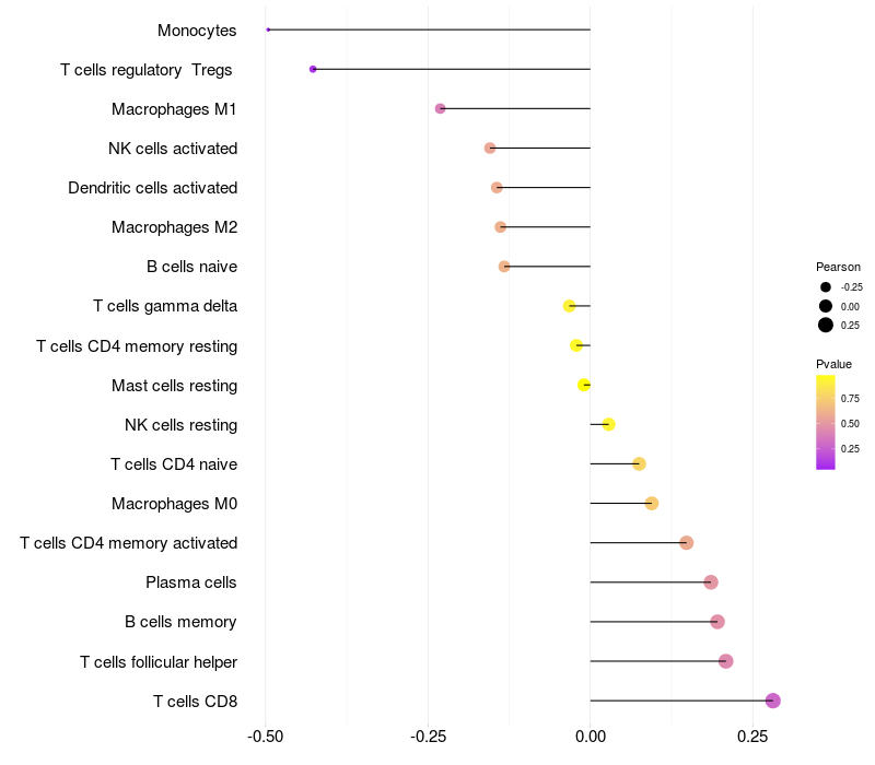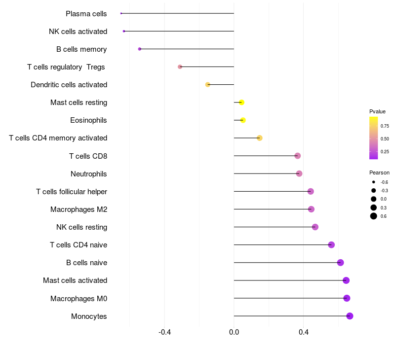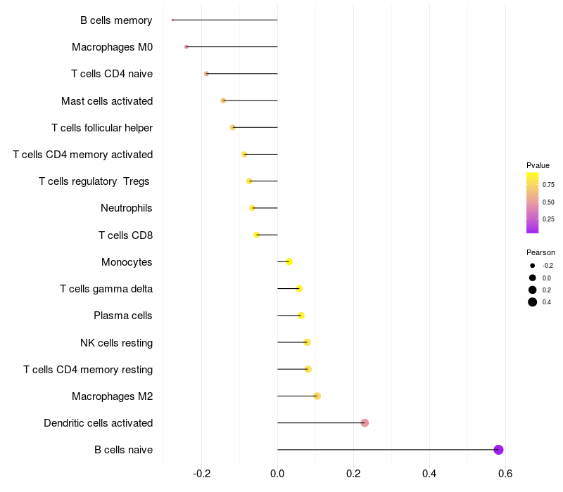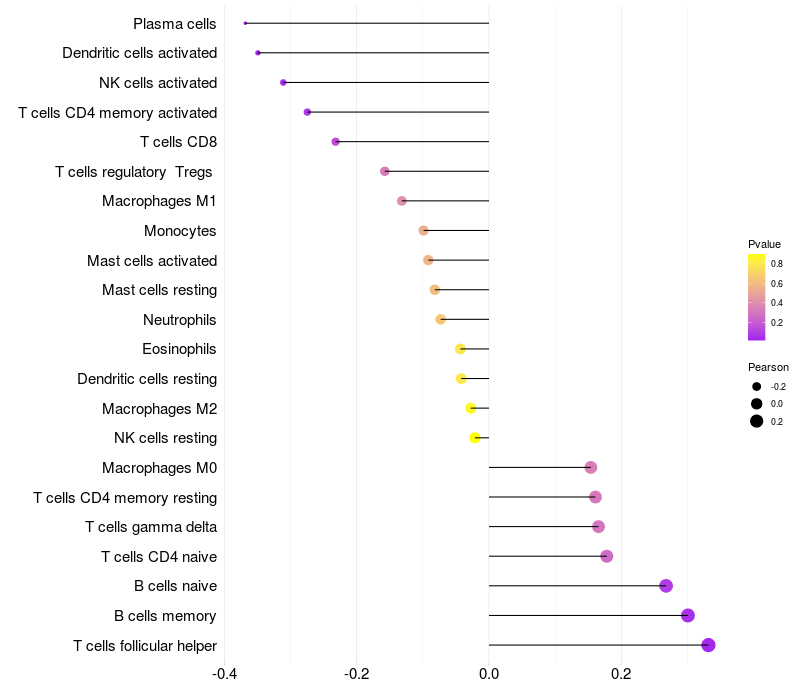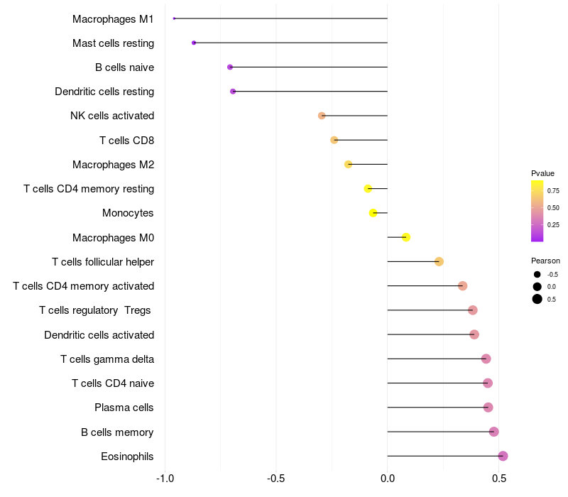 Lollipop of TMEM132B expression and immune infiltrating cell level correlation result in EBV+ samples