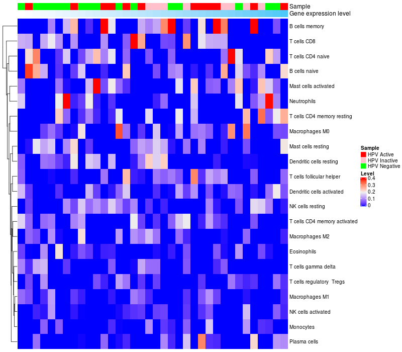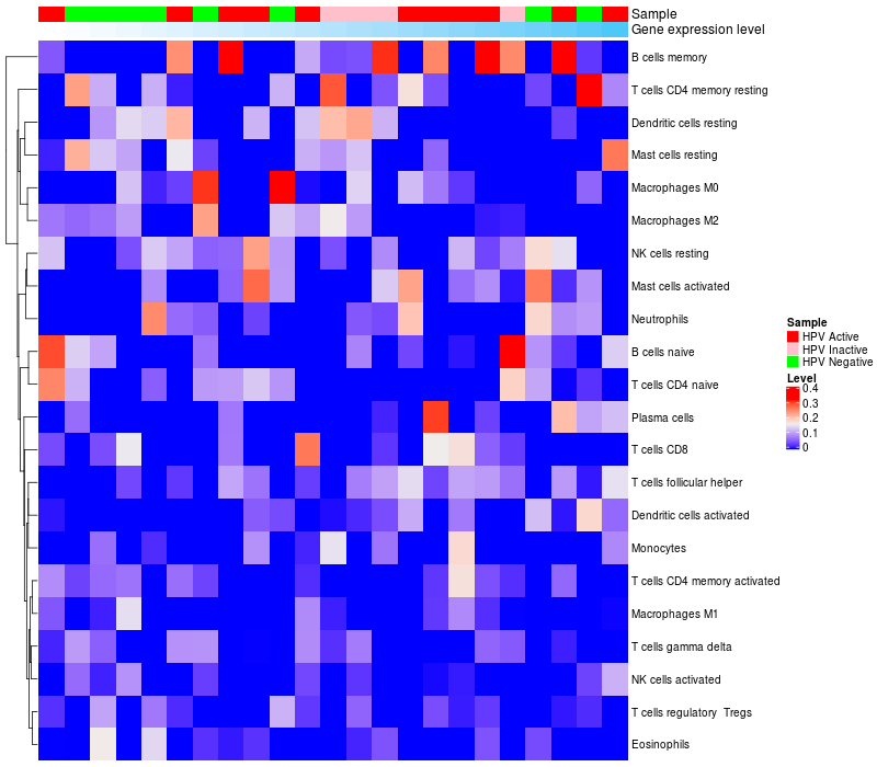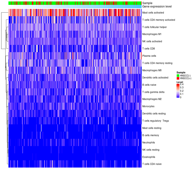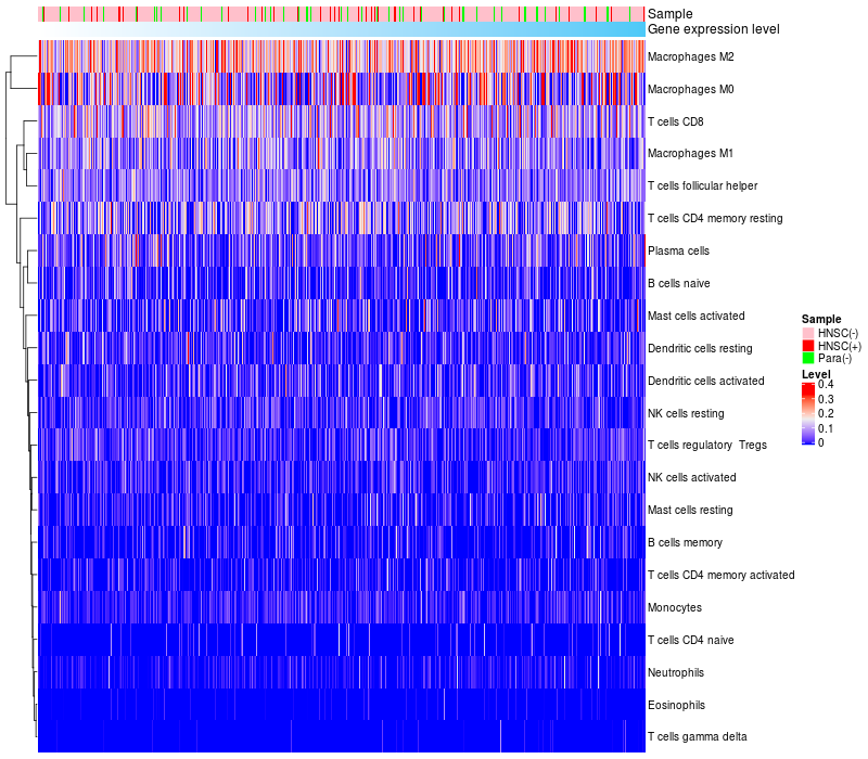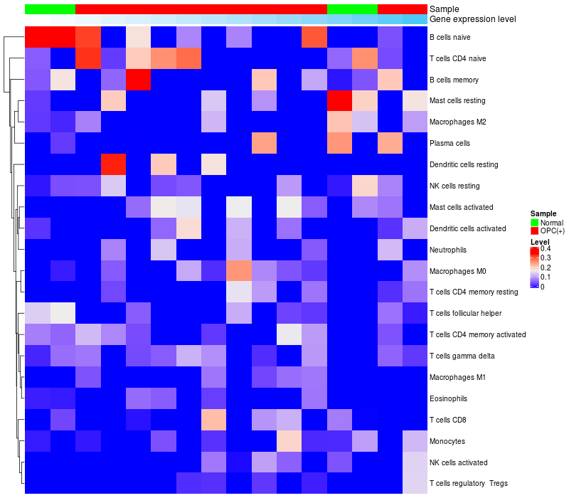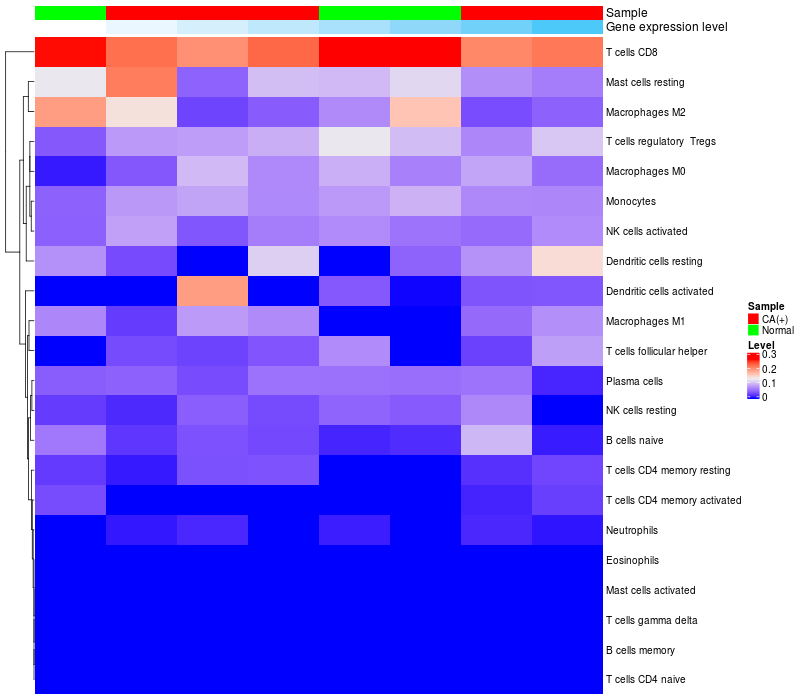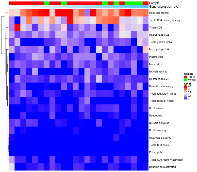 • Left: Heatmap of target gene expression and the level of various types of immune cells (cell type fractions) in all samples based on CIBERSORT method.