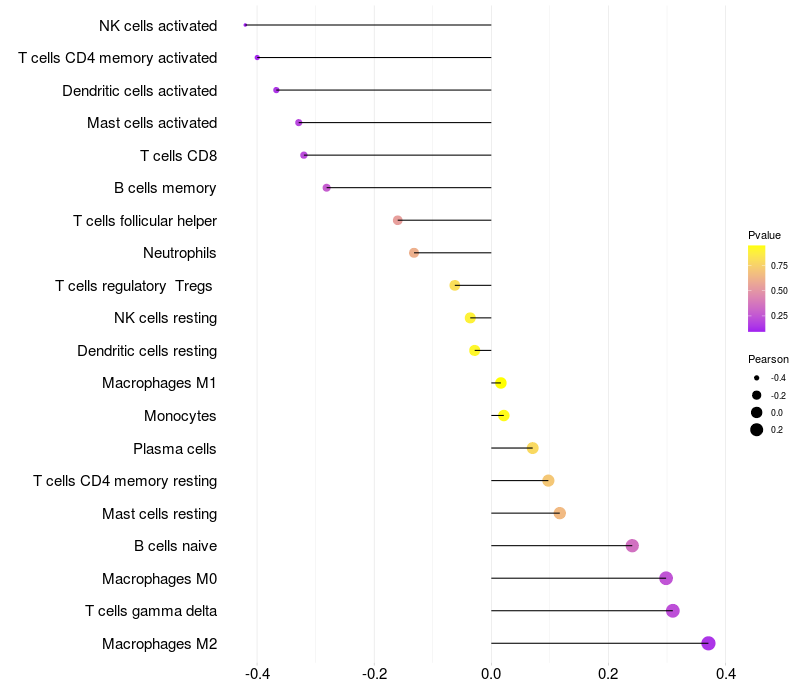• Right: Correlation of target gene expression and the level of various types of immune cells in virus positive samples (Pearson Correlation Coefficient).