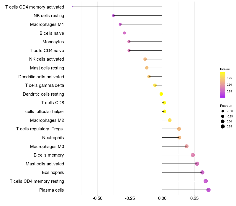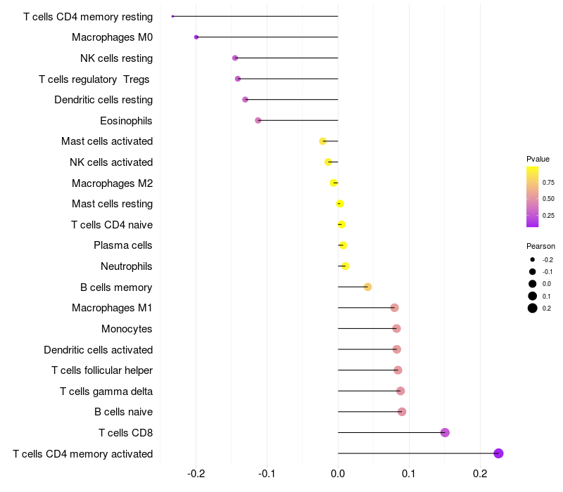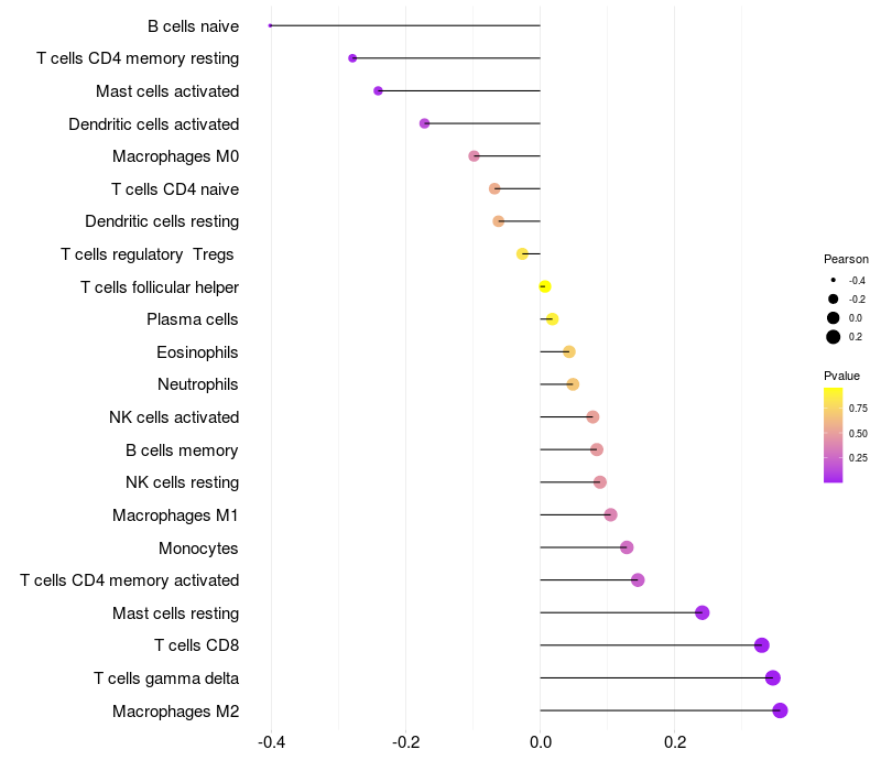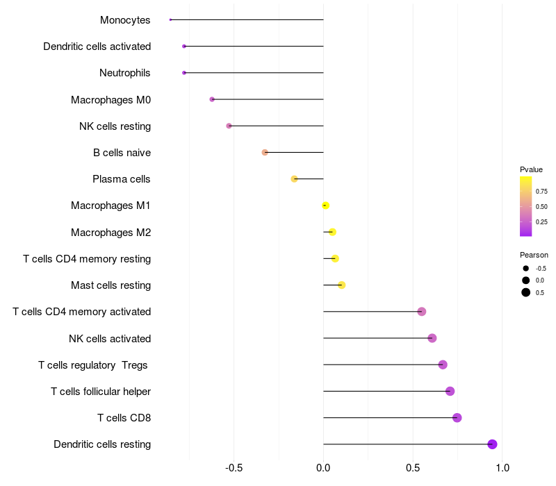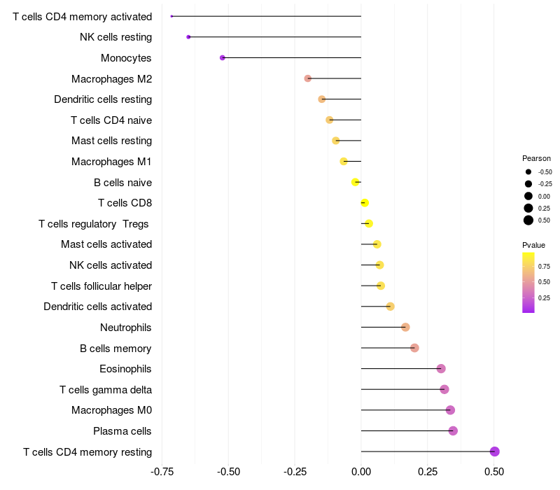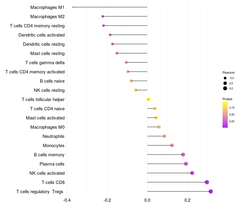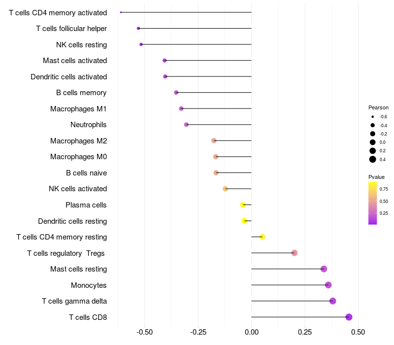 Lollipop of TMEM219 expression and immune infiltrating cell level correlation result in HPV+ samples