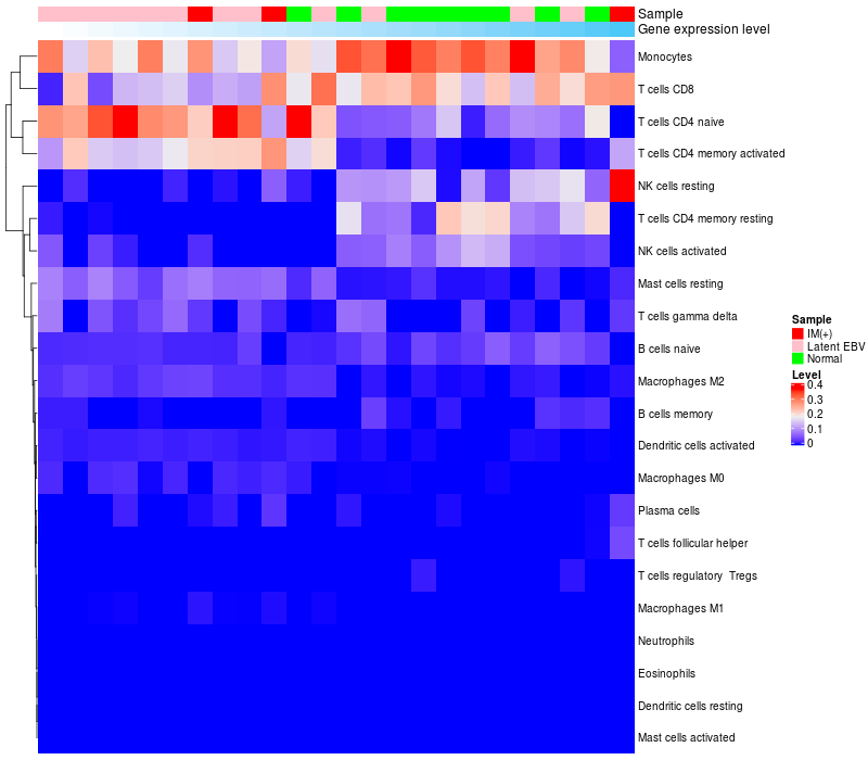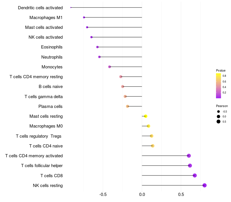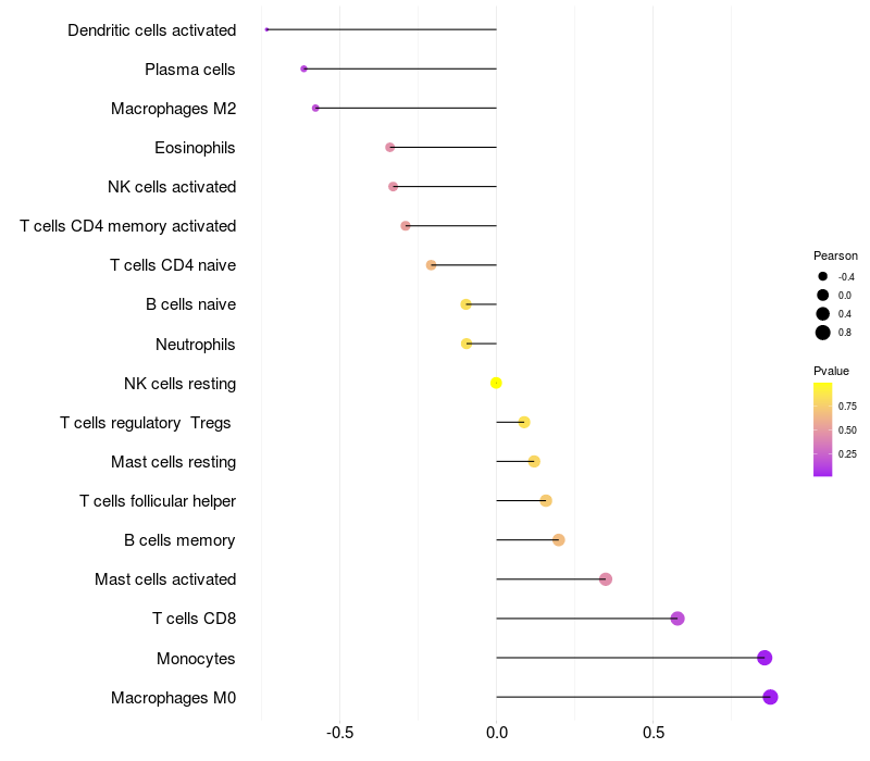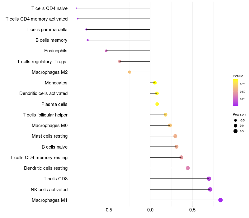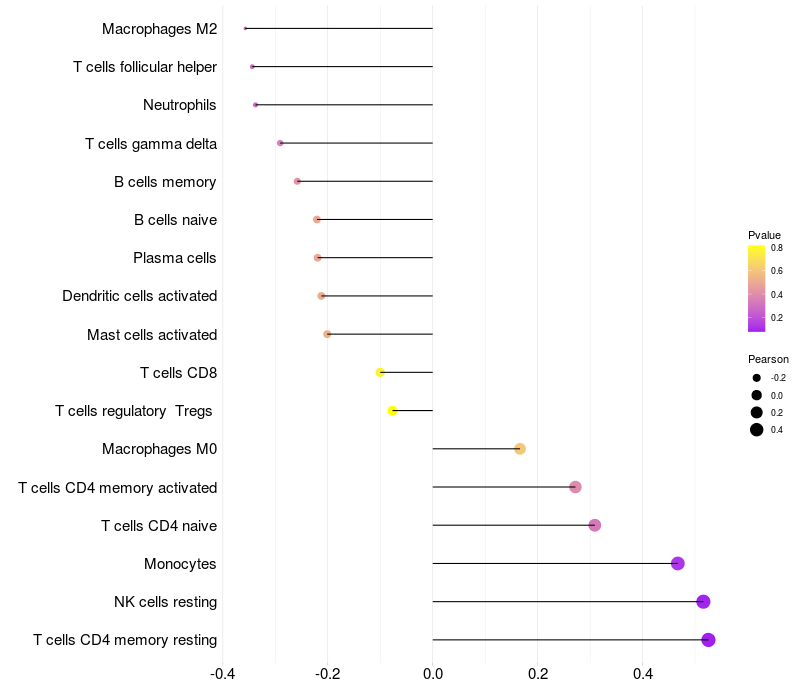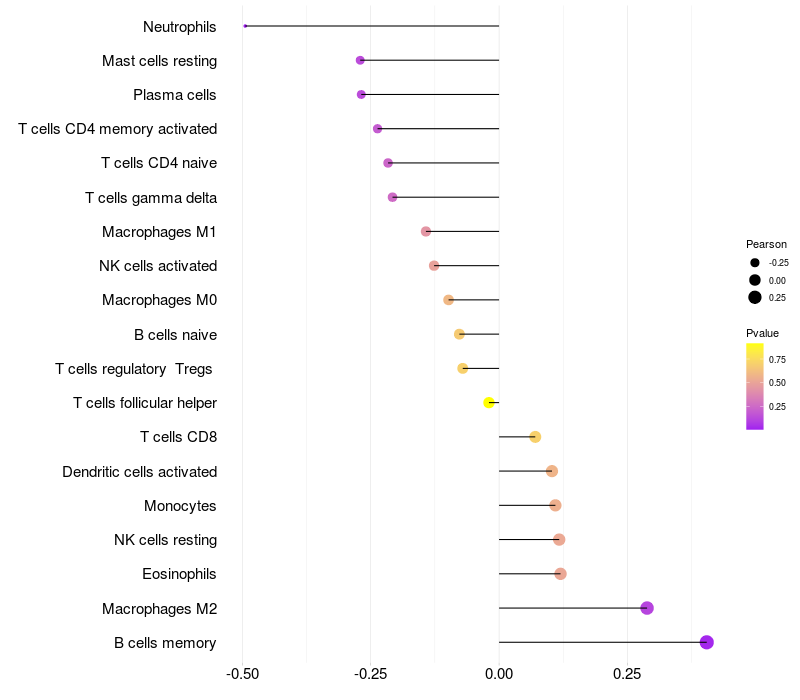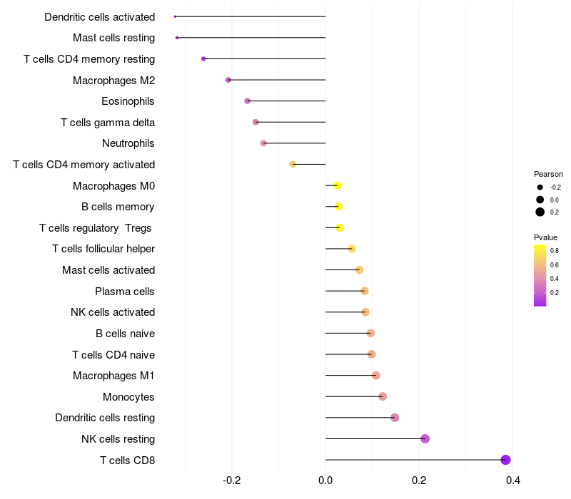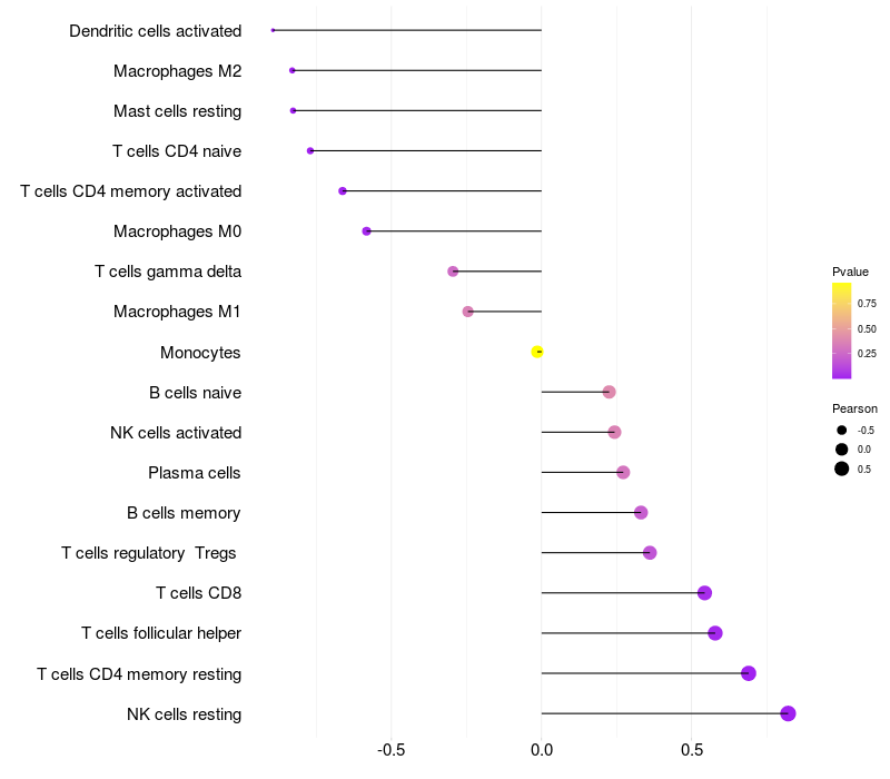 Lollipop of TMEM222 expression and immune infiltrating cell level correlation result in EBV+ samples