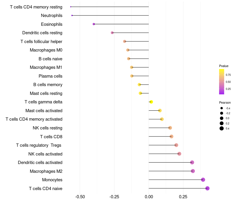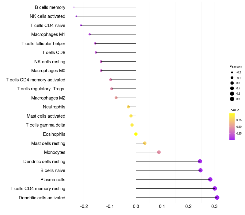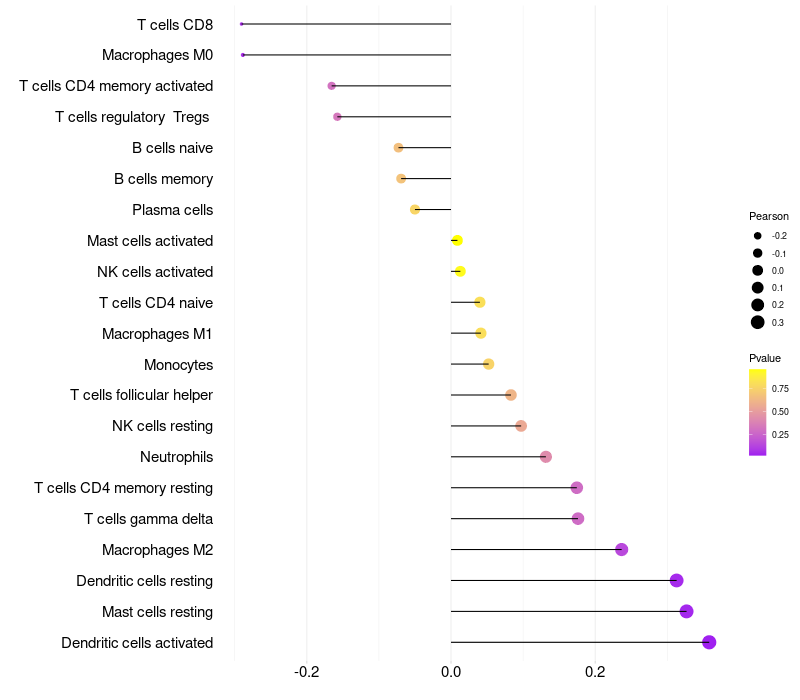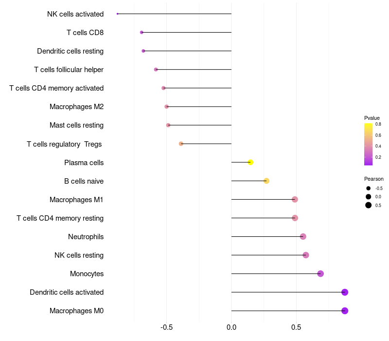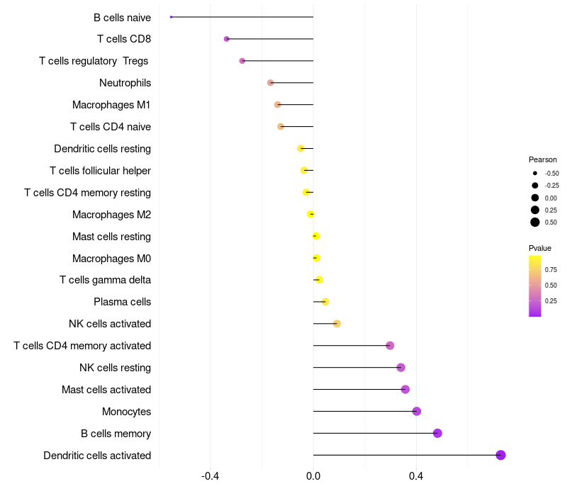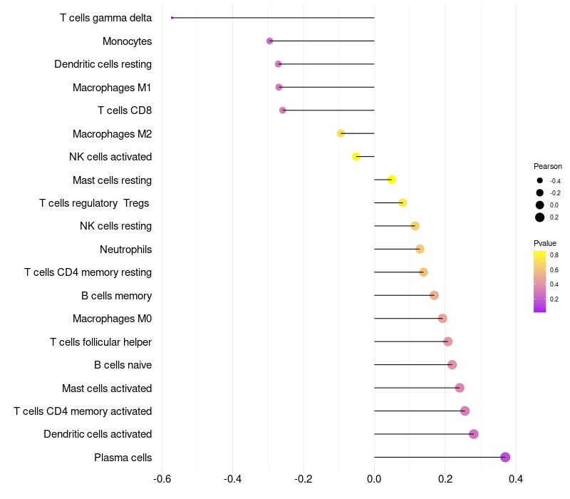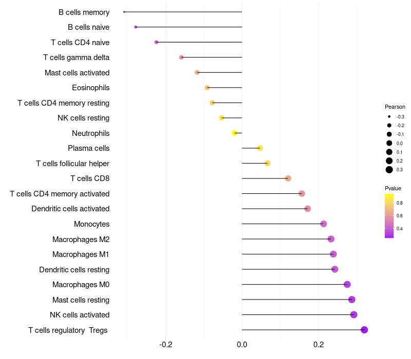 Lollipop of TMEM30B expression and immune infiltrating cell level correlation result in HPV+ samples