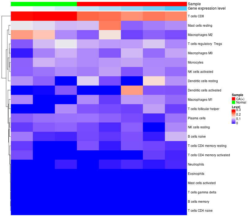 • Left: Heatmap of target gene expression and the level of various types of immune cells (cell type fractions) in all samples based on CIBERSORT method.