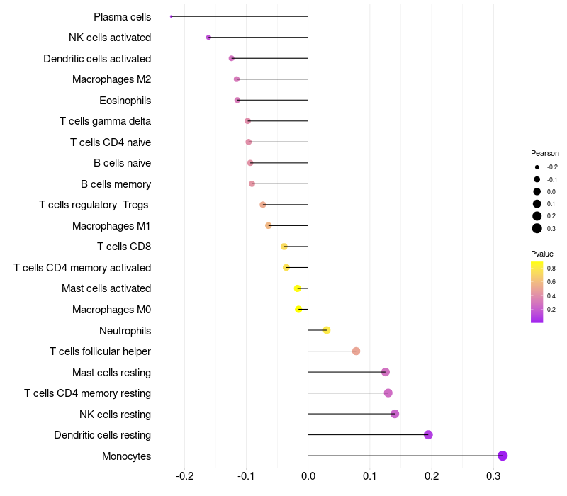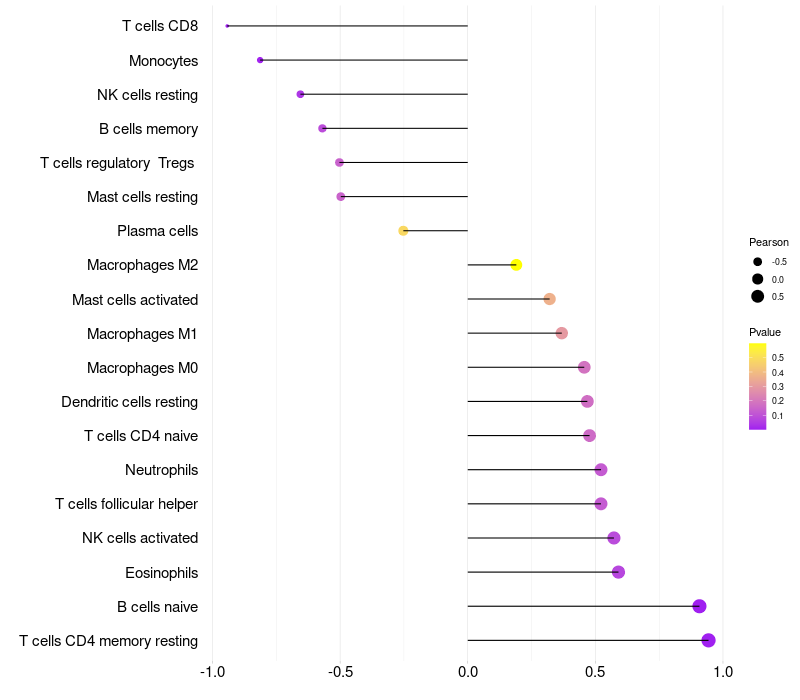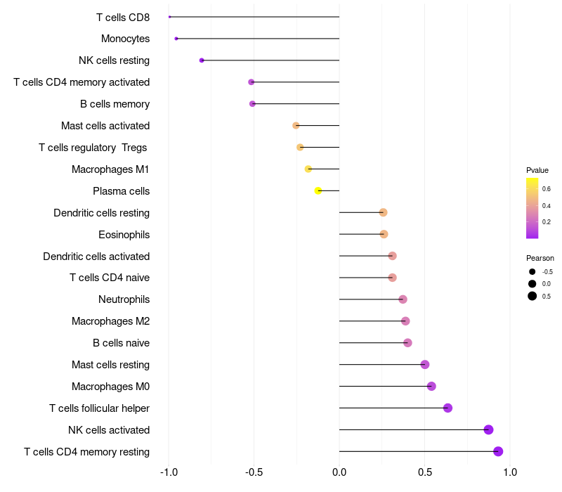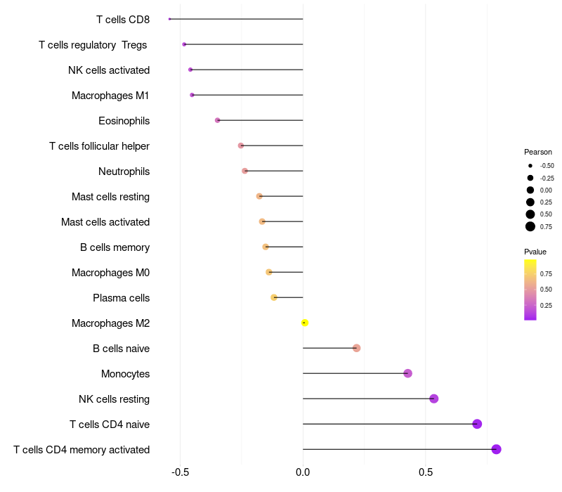 Lollipop of TMEM97 expression and immune infiltrating cell level correlation result in HBV+ Liver cirrhosis samples