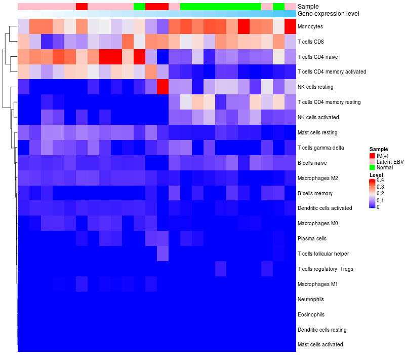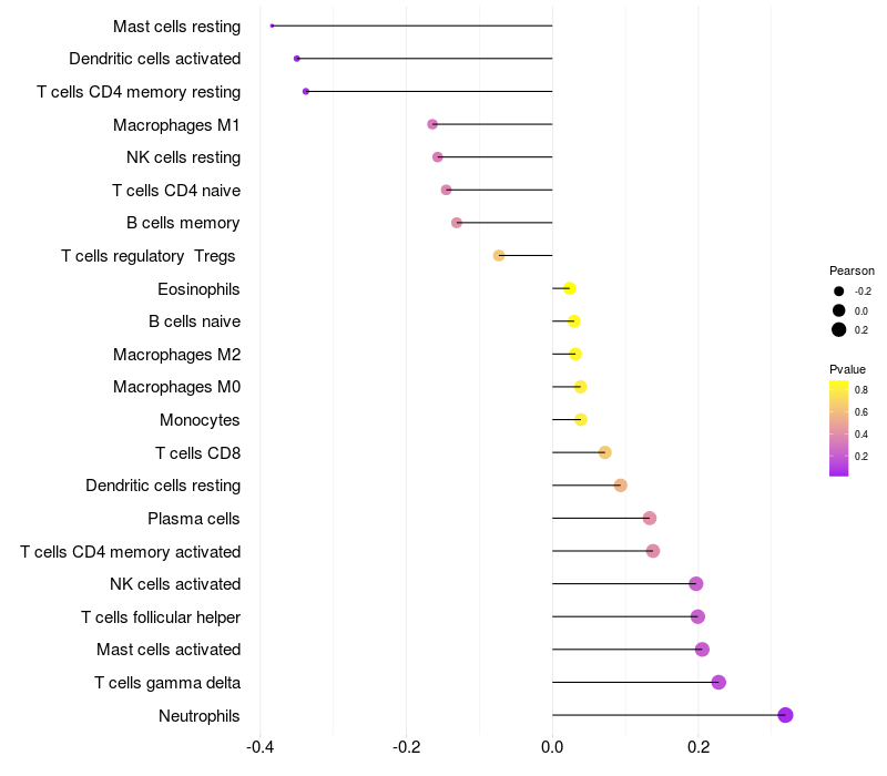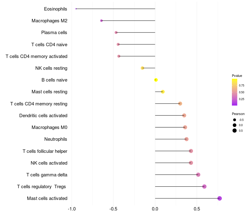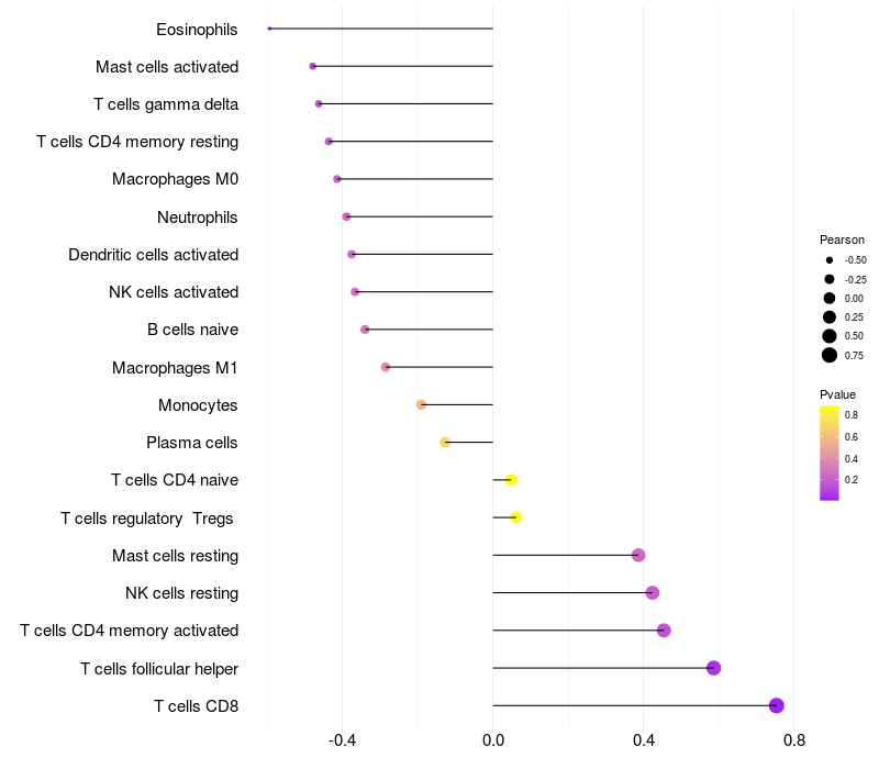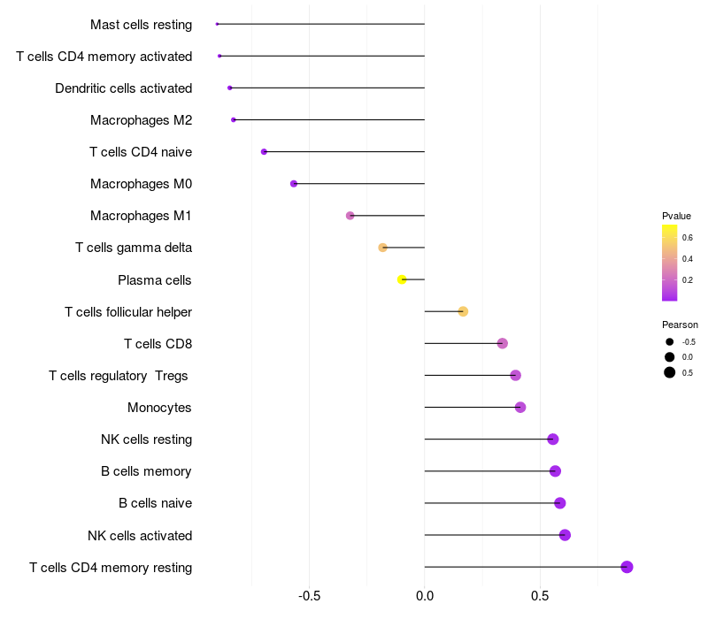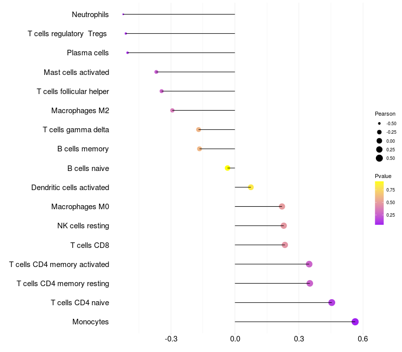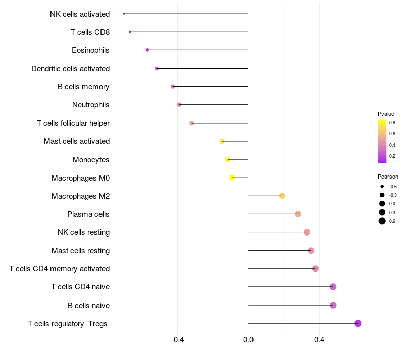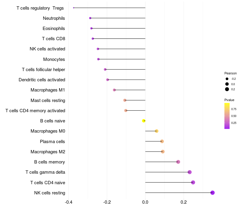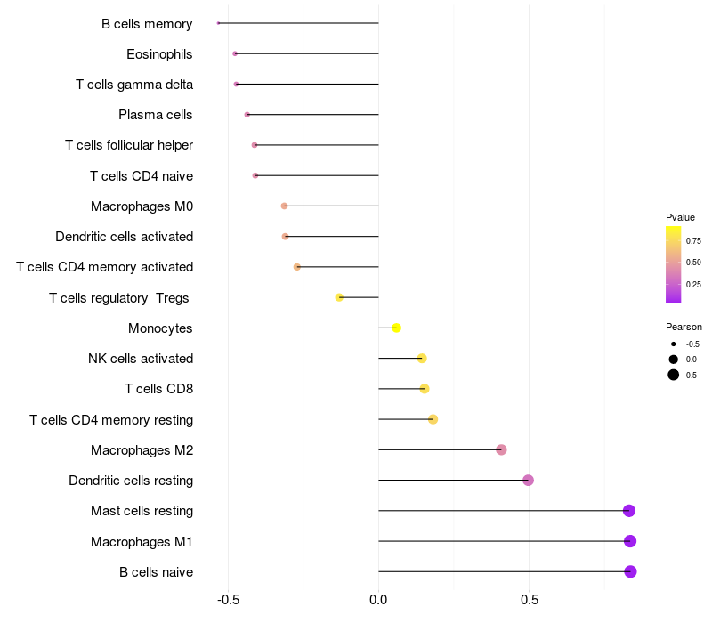 Lollipop of TMSB10 expression and immune infiltrating cell level correlation result in EBV+ samples