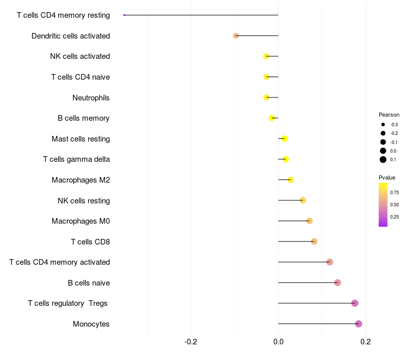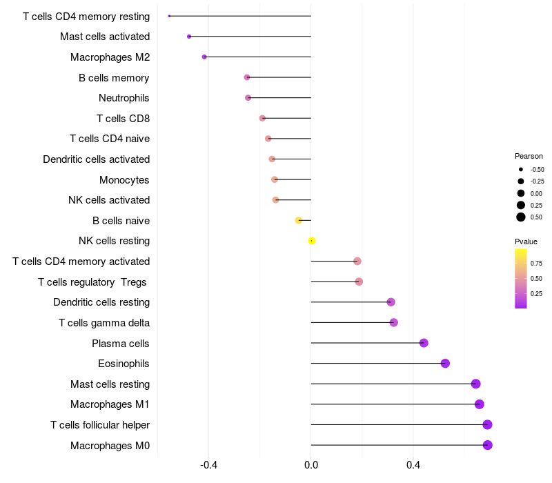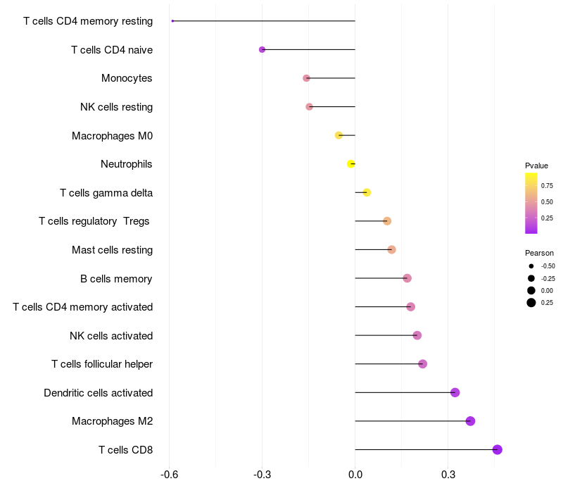 Lollipop of TNFRSF11B expression and immune infiltrating cell level correlation result in HTLV1+ samples