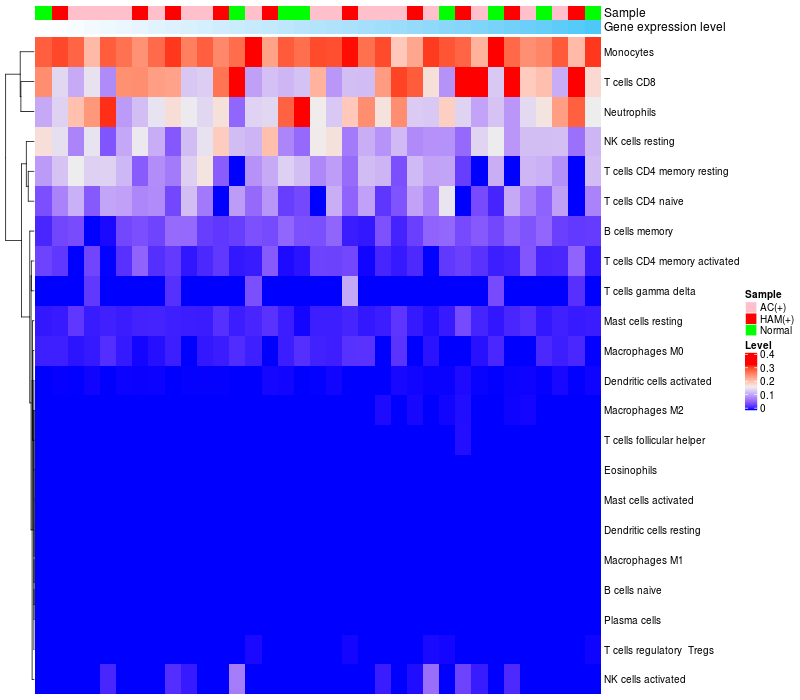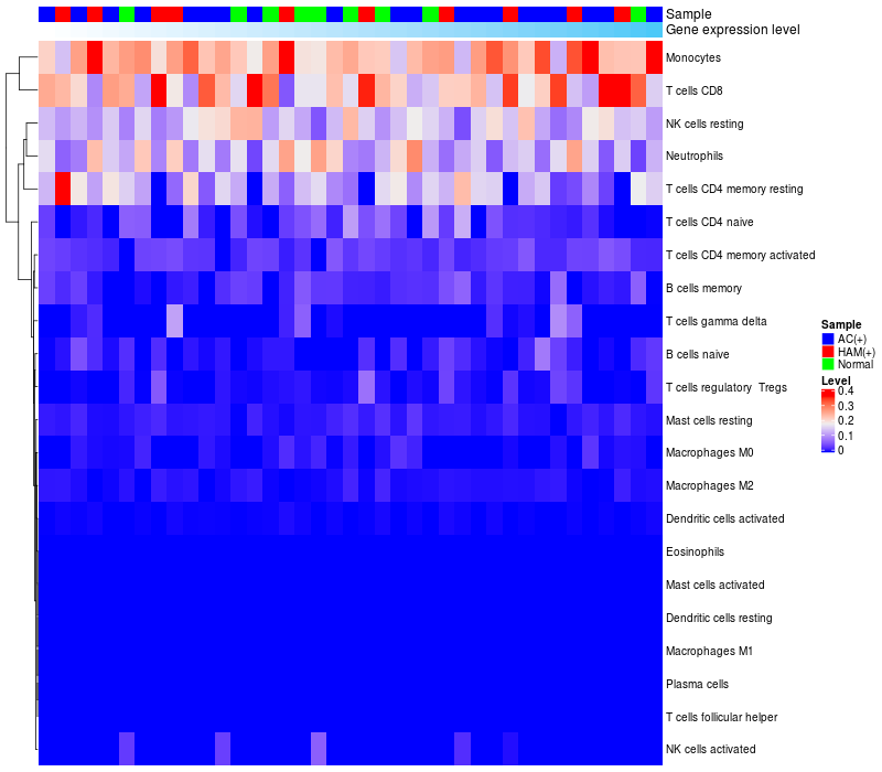 Normal (8), Asymptomatic carriers (HTLV1+)(17), HTLV-1-associated myelopathy (HTLV1+)(10) |