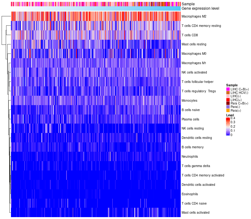 Liver hepatocellular carcinoma HCV (HBV+)(86), Liver hepatocellular carcinoma HCV (HBV-)(19), Liver hepatocellular carcinoma (HBV+)(209), Liver hepatocellular carcinoma (HBV+)(60), Paracancerous HCV (HBV+)(4), Paracancerous (HBV-)(28), Paracancerous (HBV+)(18) |
