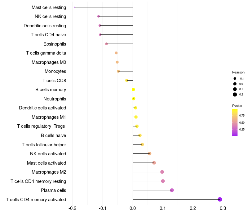 Lollipop of TNFSF13 expression and immune infiltrating cell level correlation result in HBV+ samples