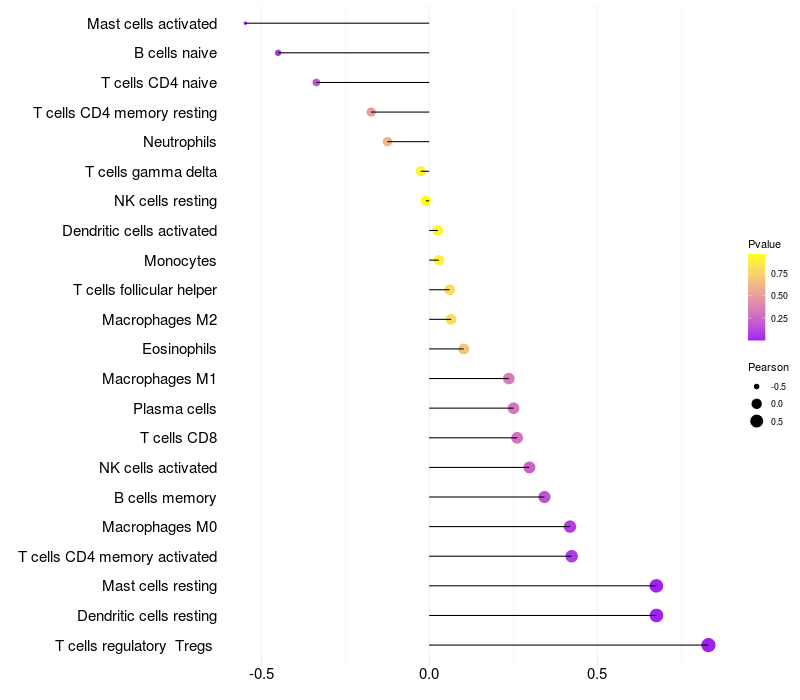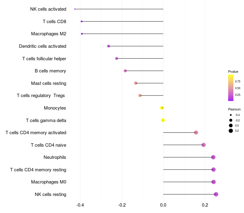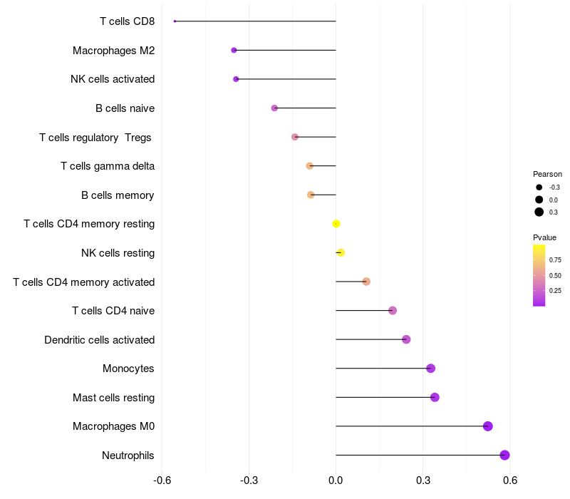 Lollipop of TNIP1 expression and immune infiltrating cell level correlation result in HTLV1+ samples