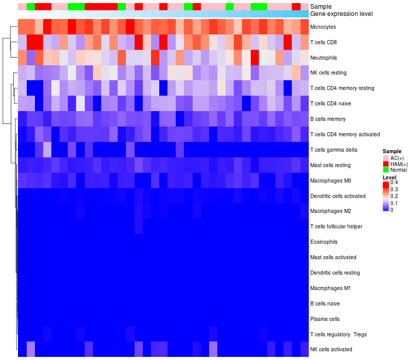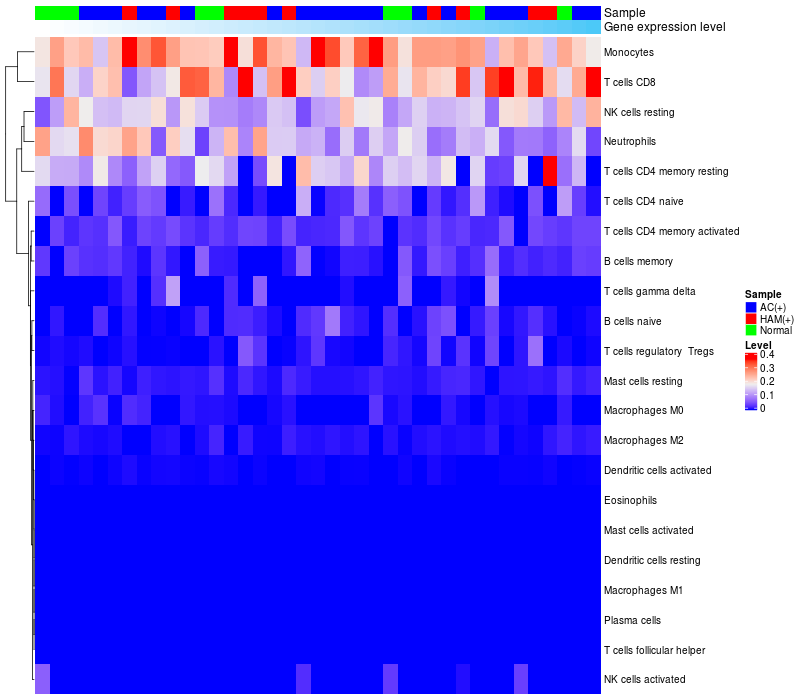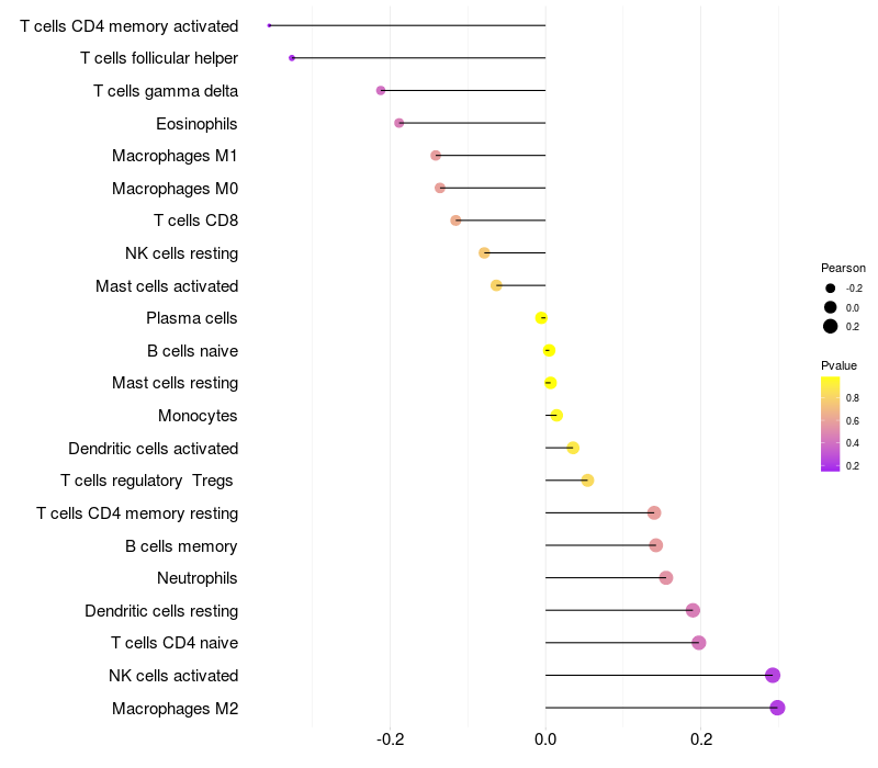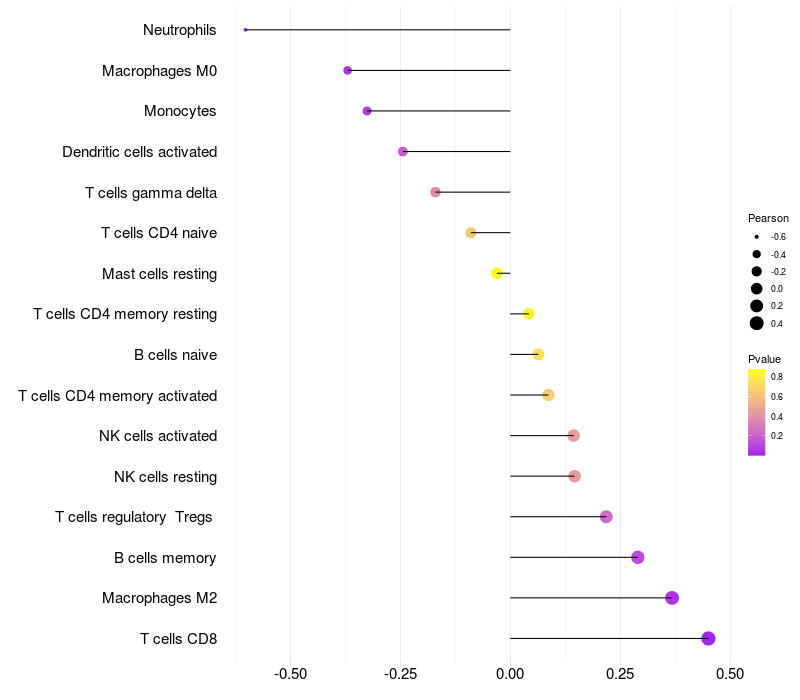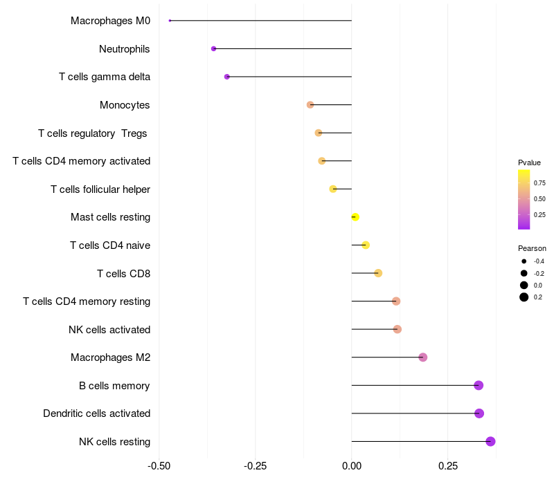 Lollipop of TNKS1BP1 expression and immune infiltrating cell level correlation result in HTLV1+ samples
