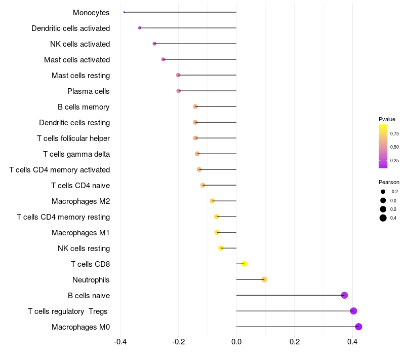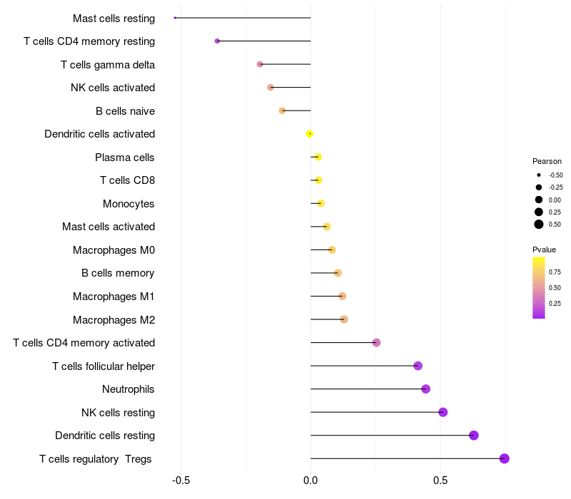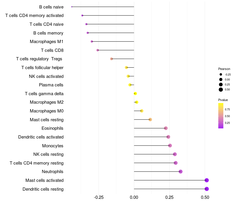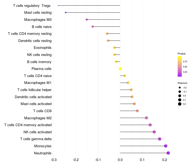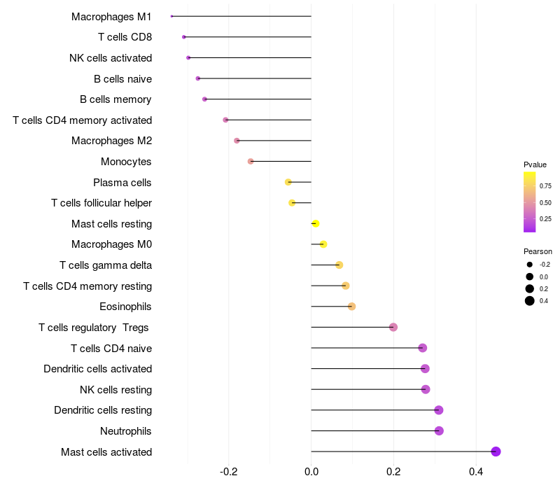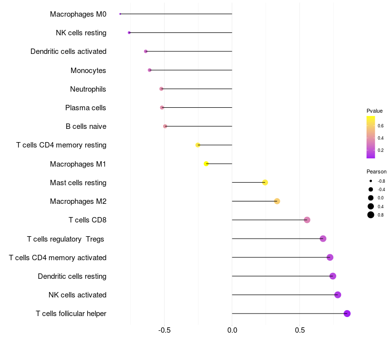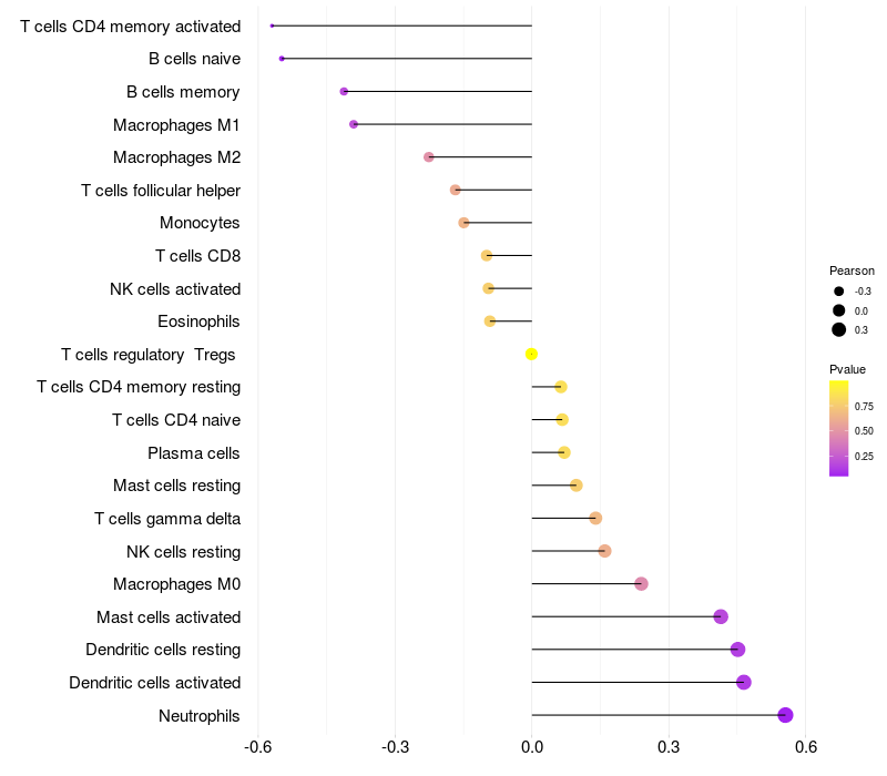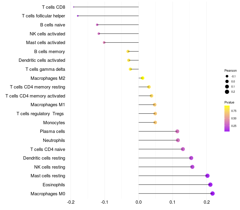 Lollipop of TOLLIP expression and immune infiltrating cell level correlation result in HPV+ samples