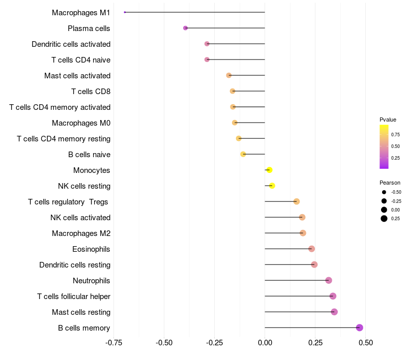 Lollipop of TOP3A expression and immune infiltrating cell level correlation result in HBV+ Liver cirrhosis samples