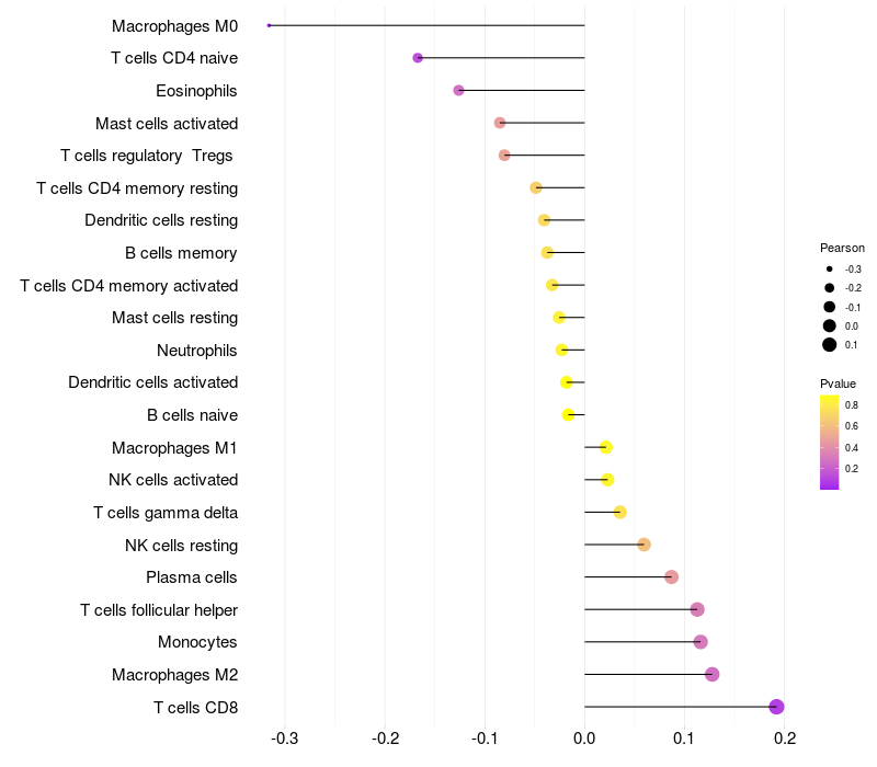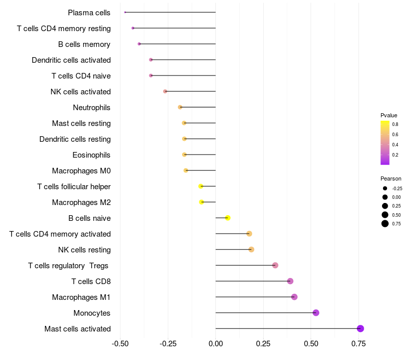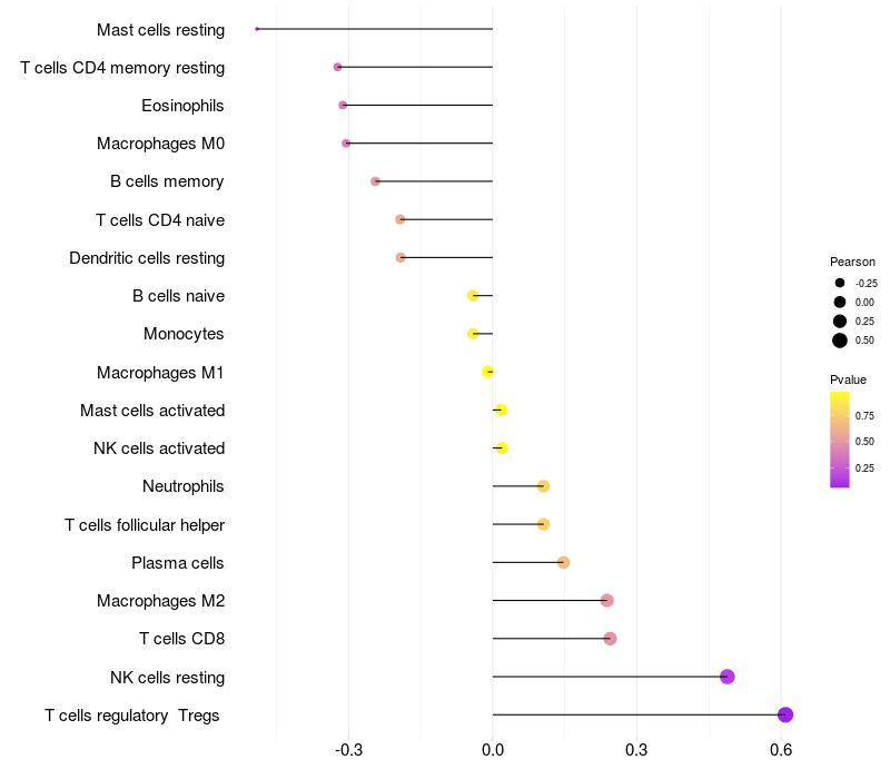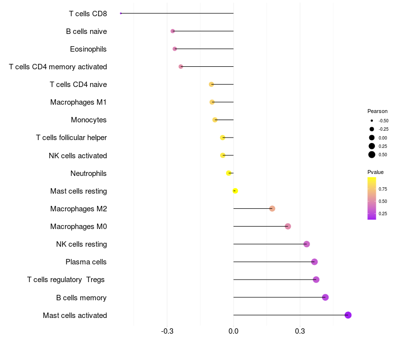 Lollipop of TPCN2 expression and immune infiltrating cell level correlation result in HBV+ Liver cirrhosis samples