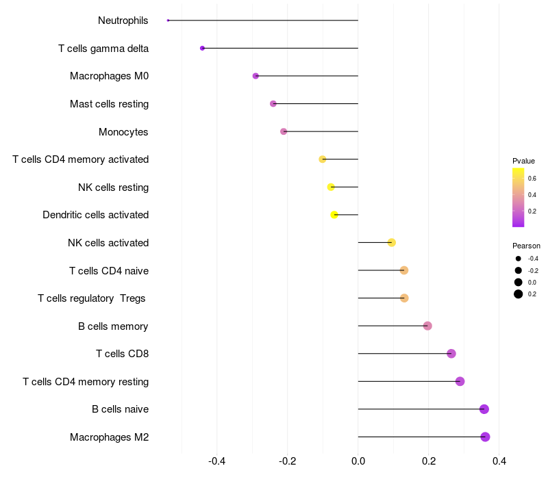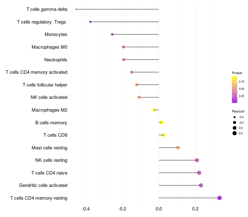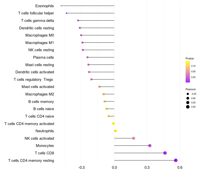 Lollipop of TPD52 expression and immune infiltrating cell level correlation result in HTLV1+ samples