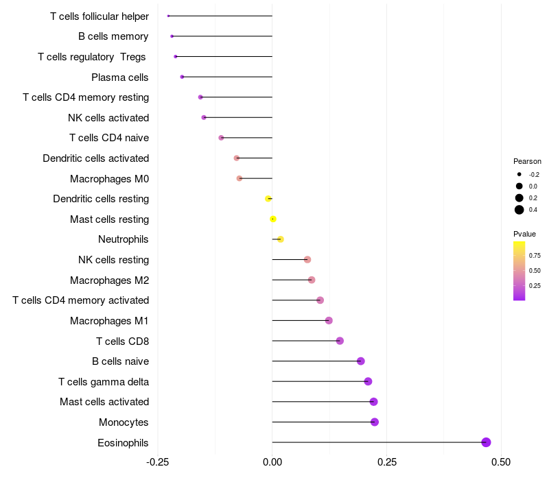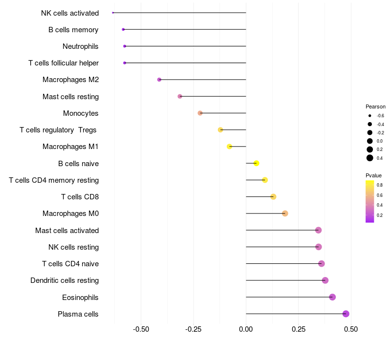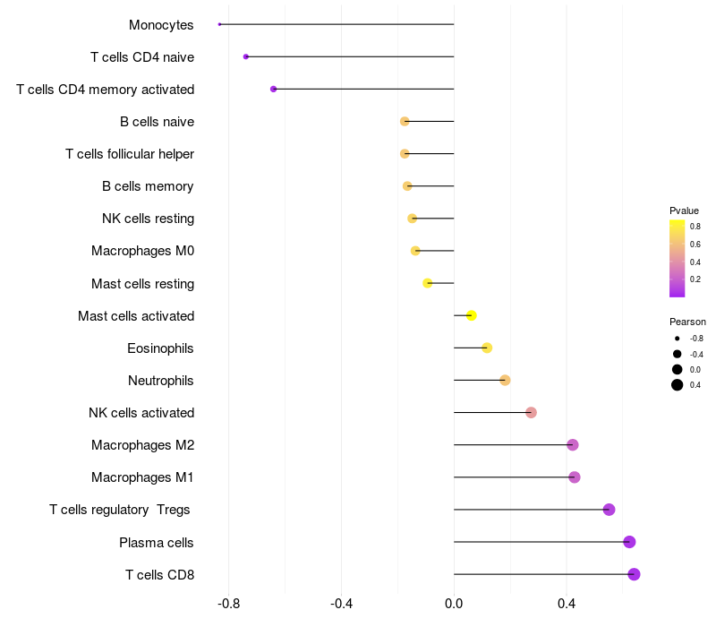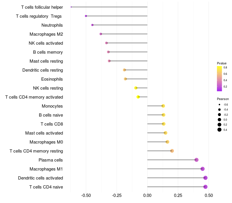 Lollipop of TPD52L1 expression and immune infiltrating cell level correlation result in HBV+ Chronic HBV (CHB) infection samples
