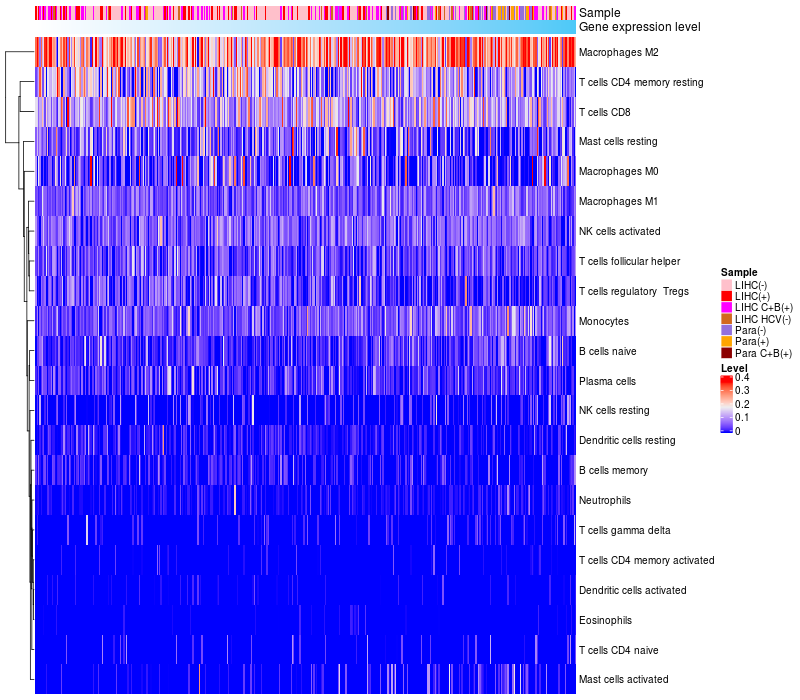 Liver hepatocellular carcinoma HCV (HBV+)(86), Liver hepatocellular carcinoma HCV (HBV-)(19), Liver hepatocellular carcinoma (HBV+)(209), Liver hepatocellular carcinoma (HBV+)(60), Paracancerous HCV (HBV+)(4), Paracancerous (HBV-)(28), Paracancerous (HBV+)(18) |