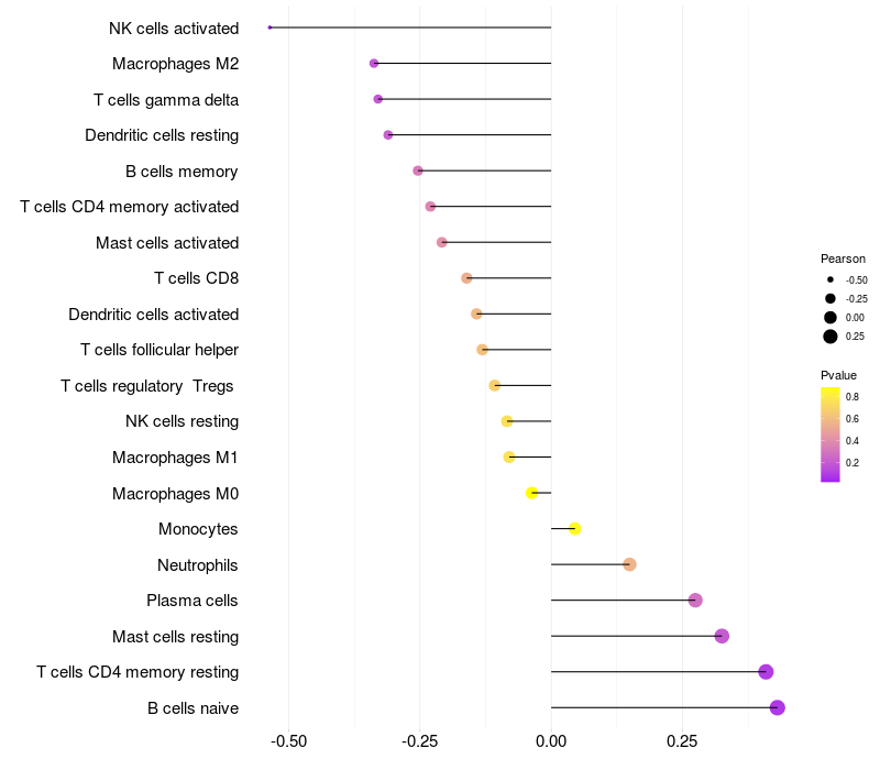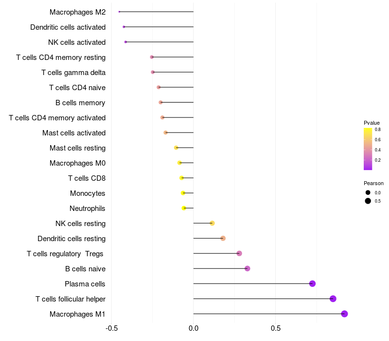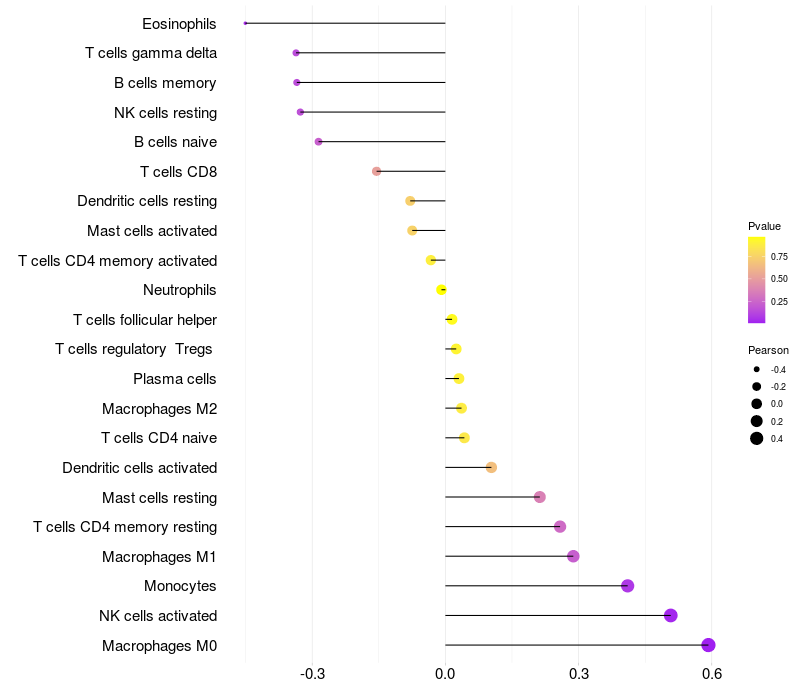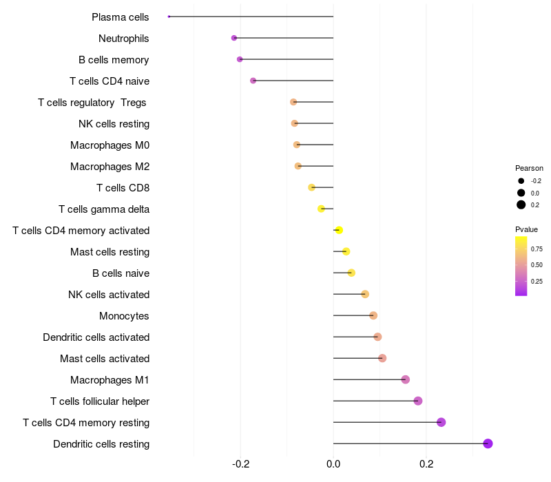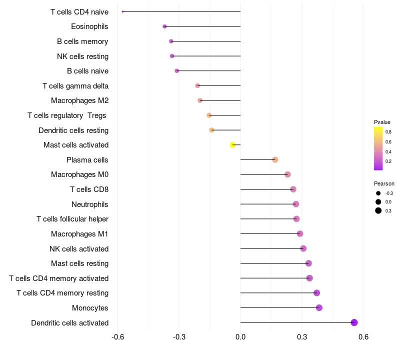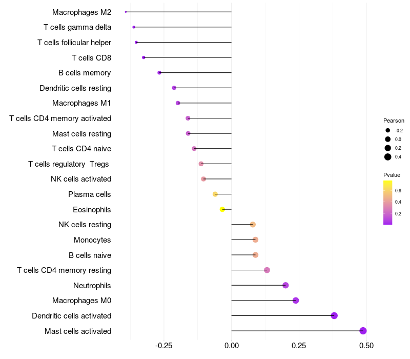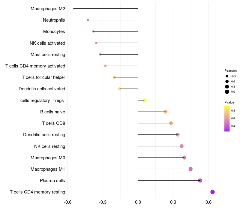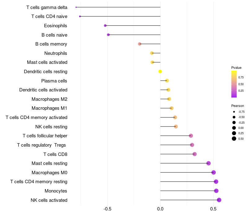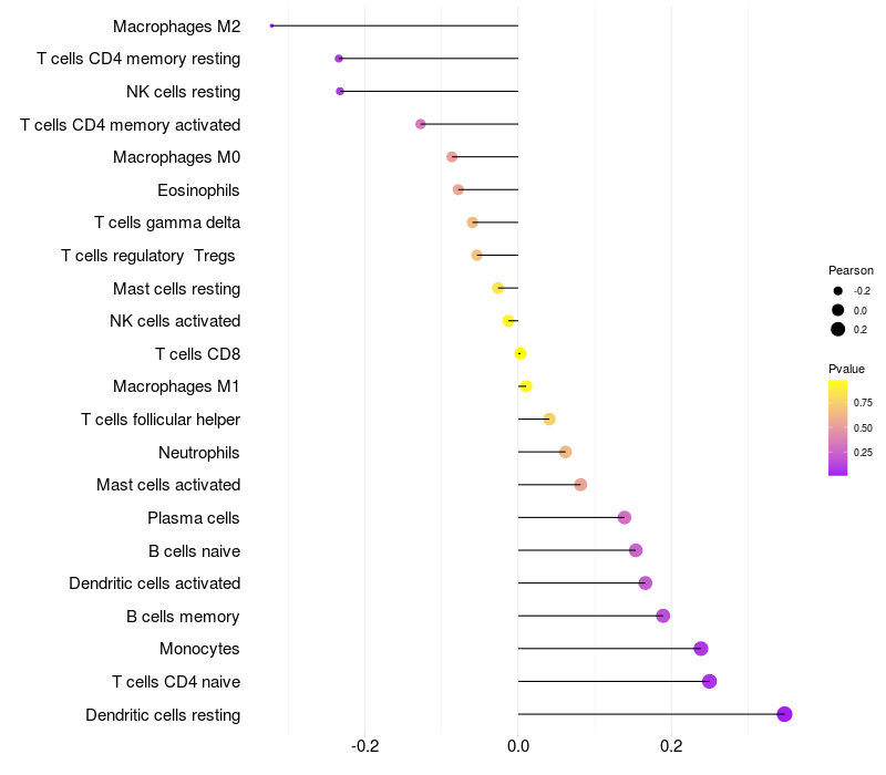Lollipop of TRAF3IP1 expression and immune infiltrating cell level correlation result in HPV+ samples