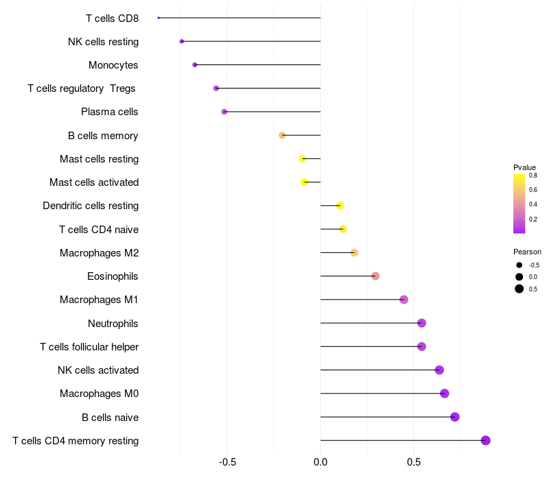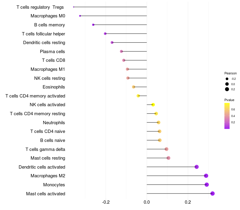 Lollipop of TRAM2 expression and immune infiltrating cell level correlation result in HBV+ Liver cirrhosis samples