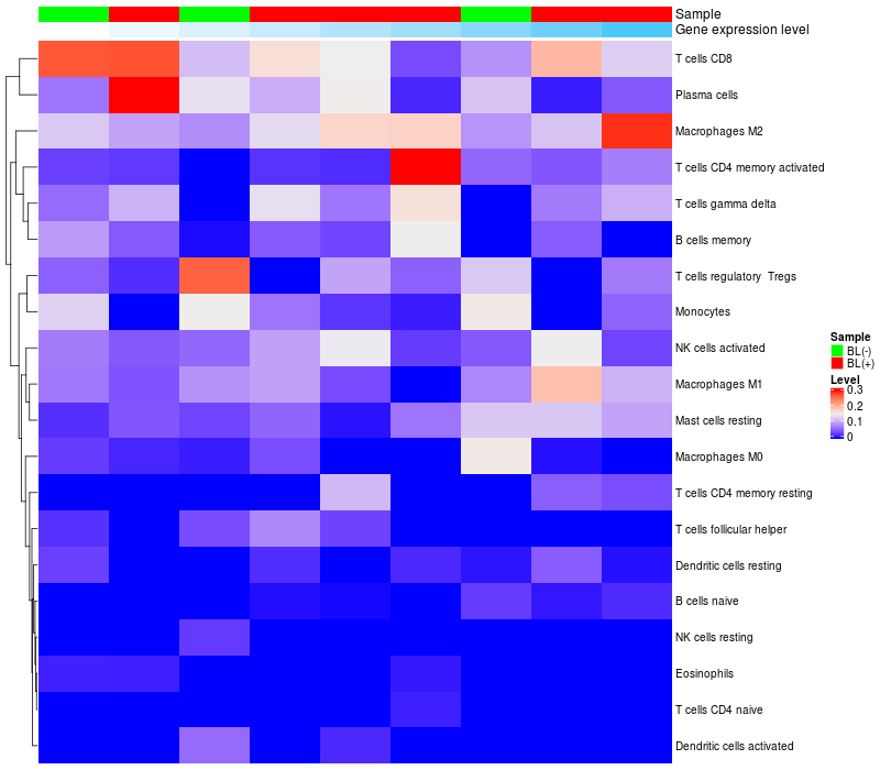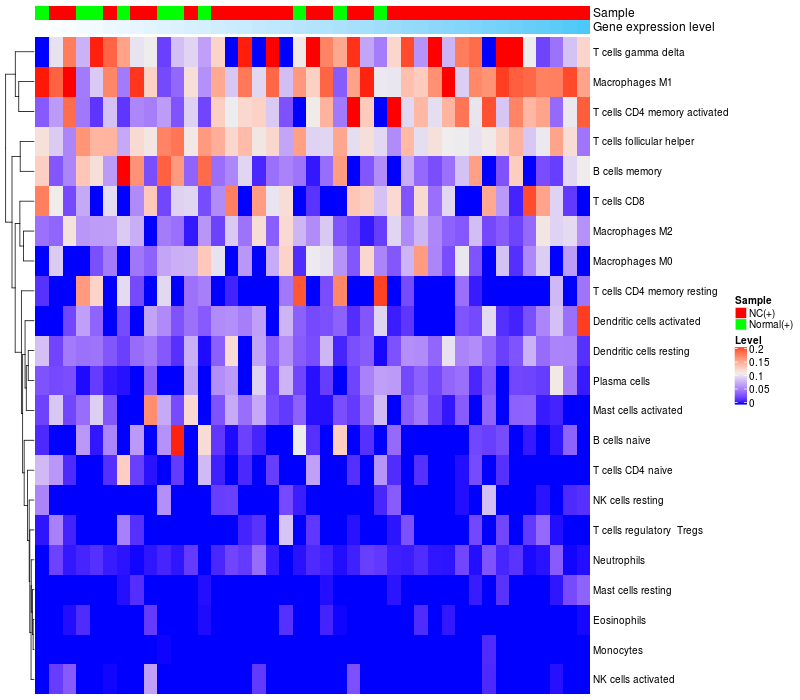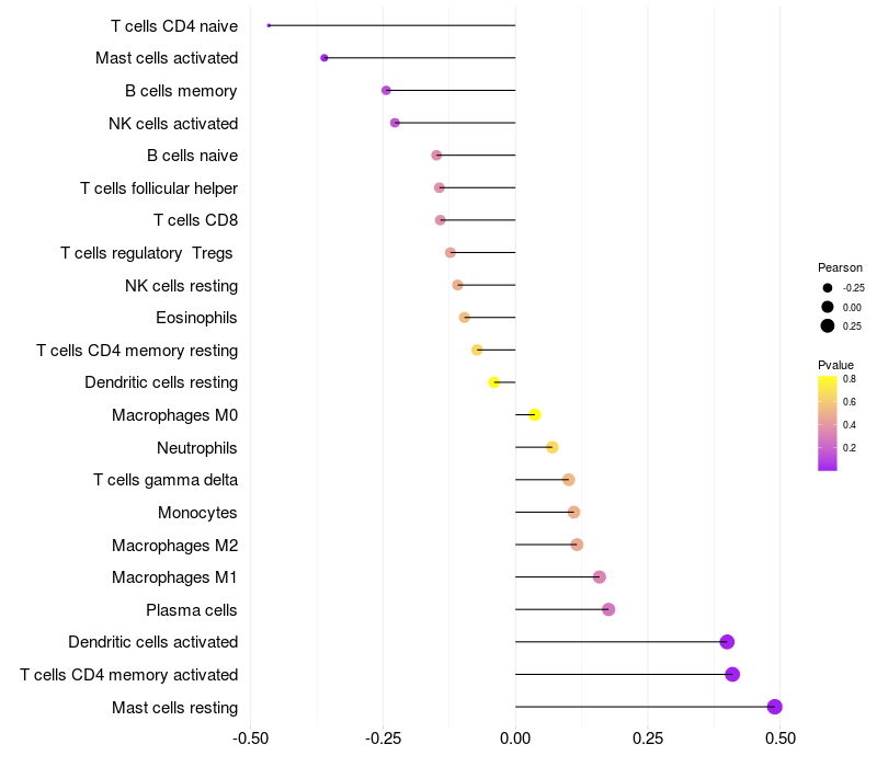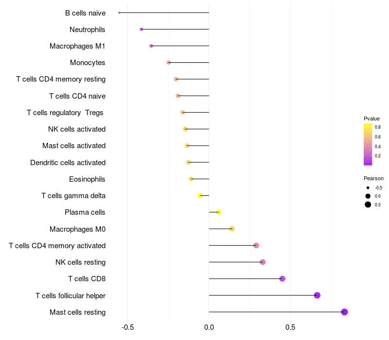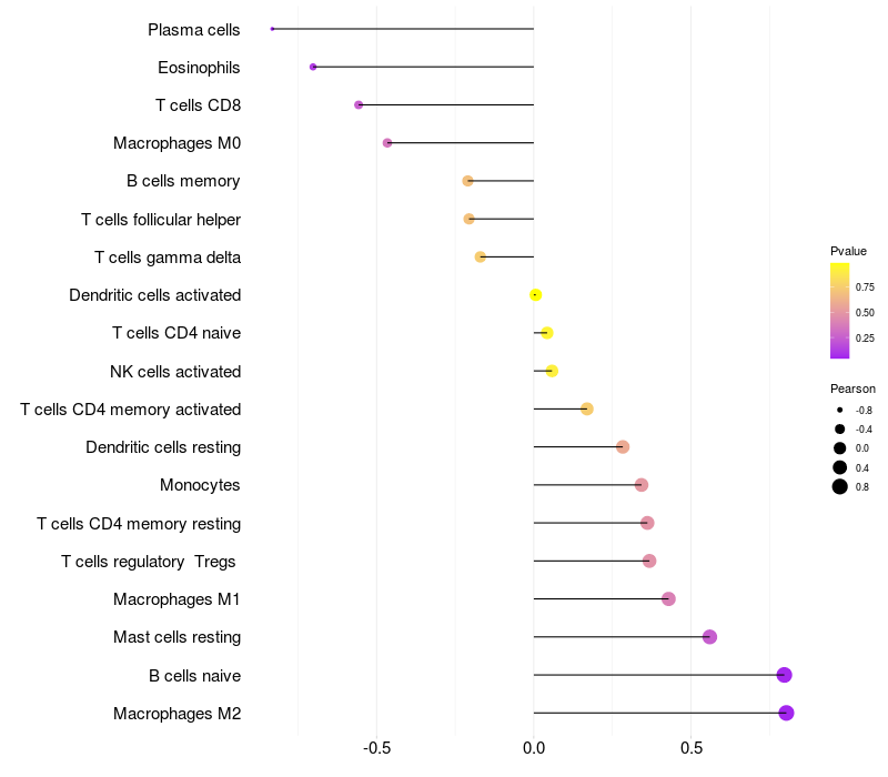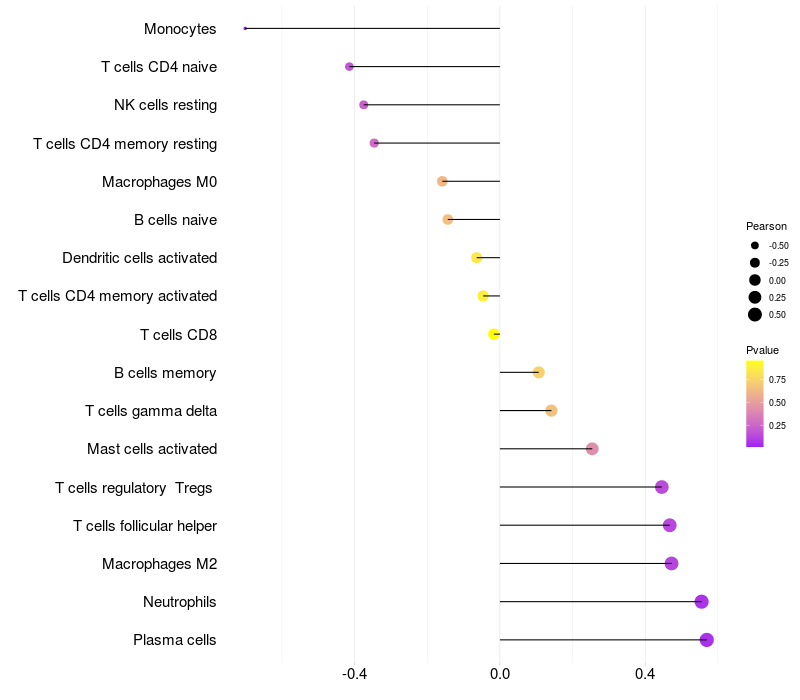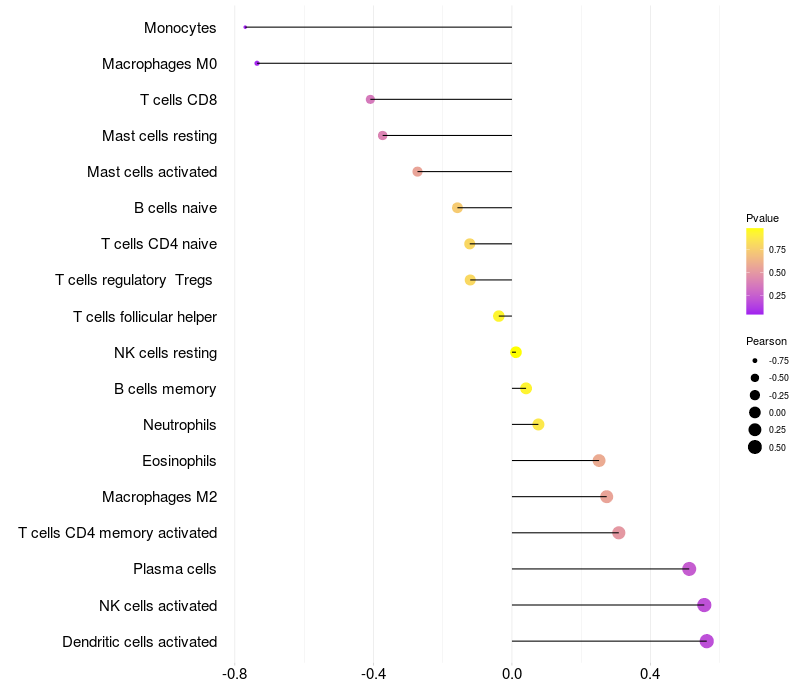 Lollipop of TRAPPC13 expression and immune infiltrating cell level correlation result in EBV+ samples