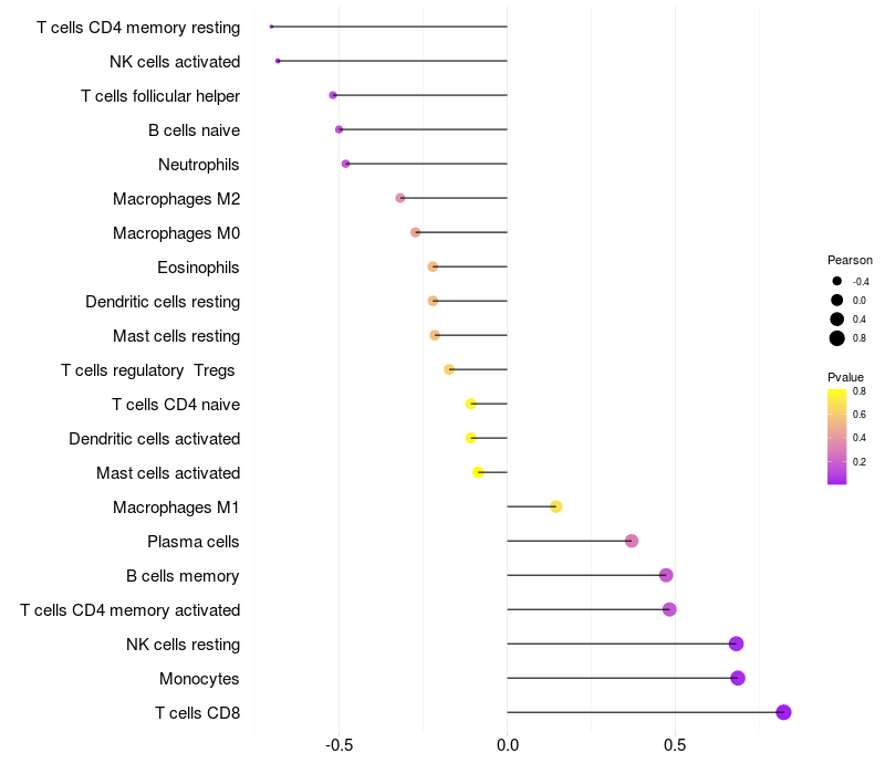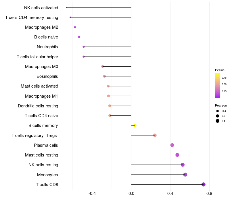 Lollipop of TRDN expression and immune infiltrating cell level correlation result in HBV+ Chronic HBV (CHB) infection samples