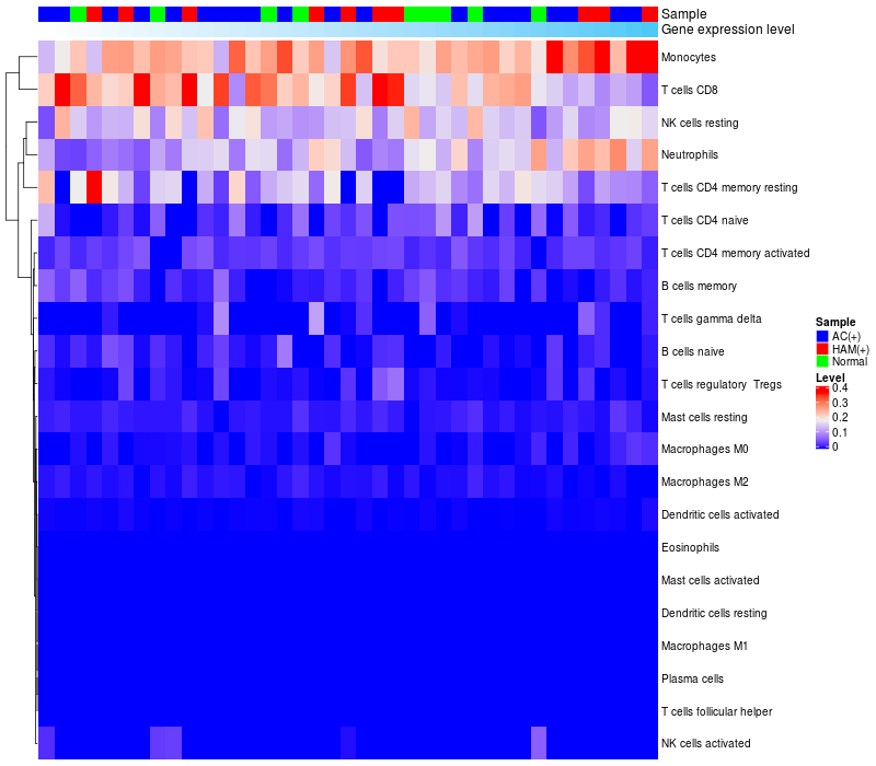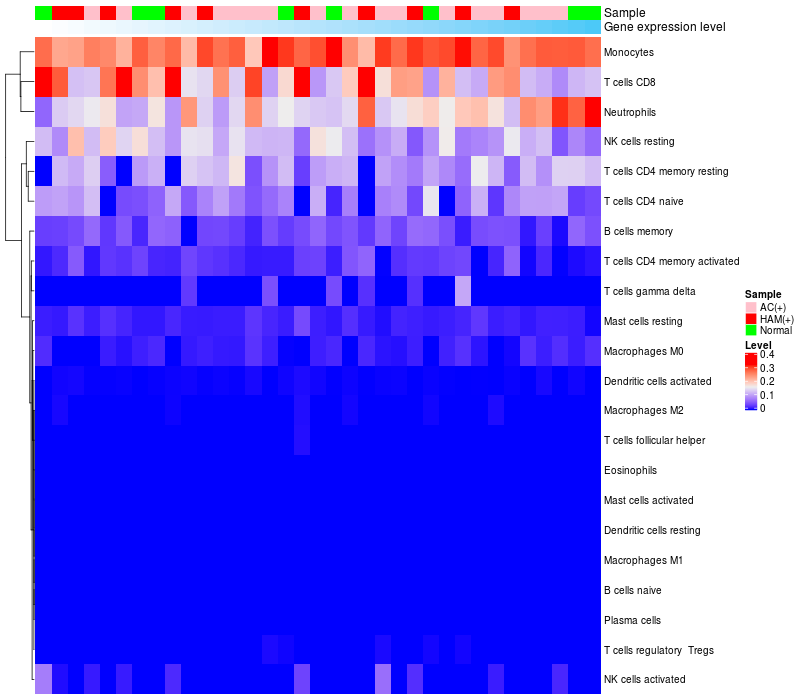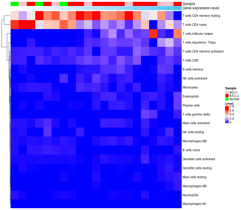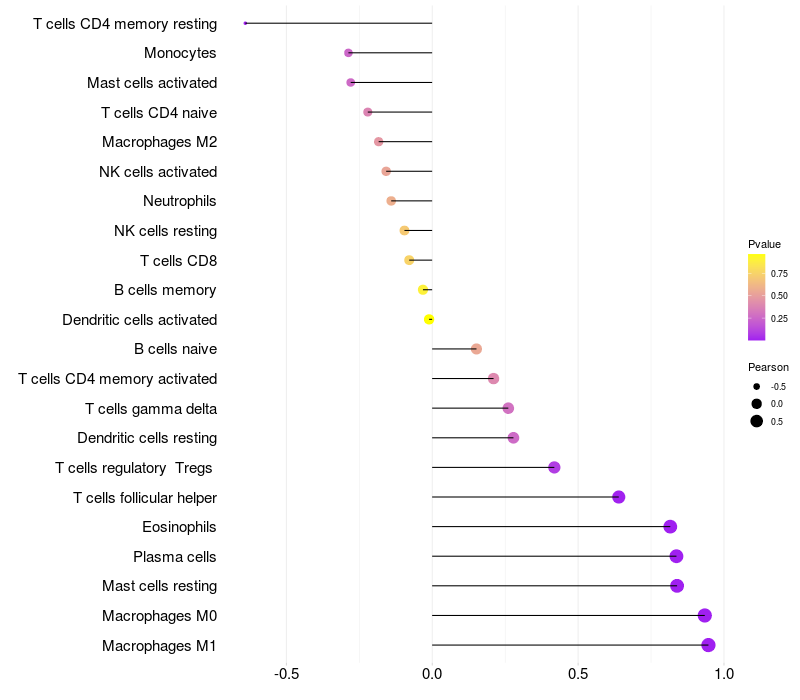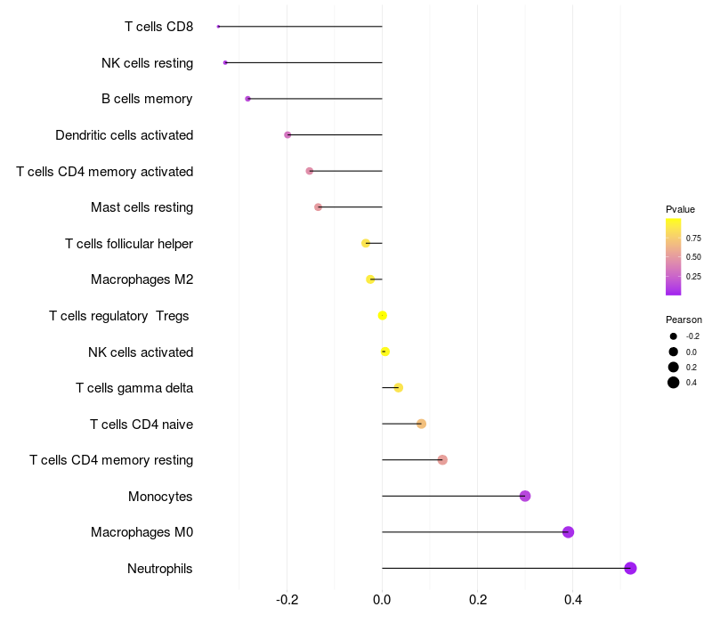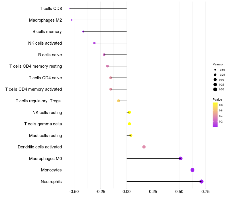 Lollipop of TRIB1 expression and immune infiltrating cell level correlation result in HTLV1+ samples