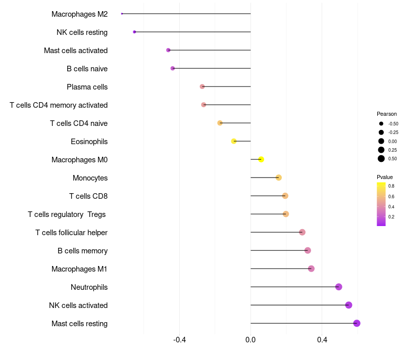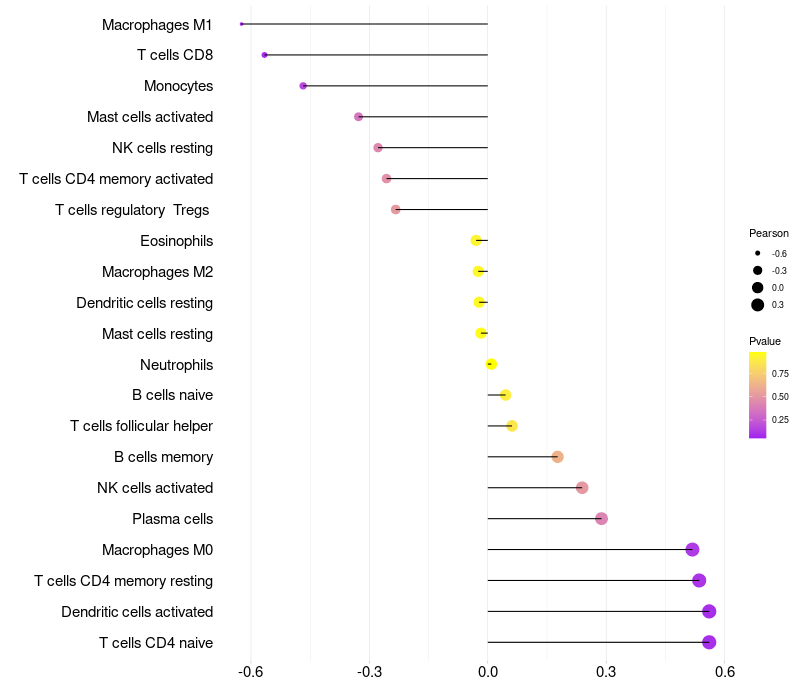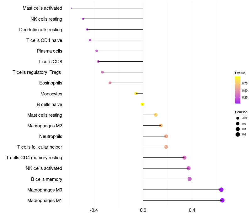 Lollipop of TRIM23 expression and immune infiltrating cell level correlation result in HBV+ Liver cirrhosis samples