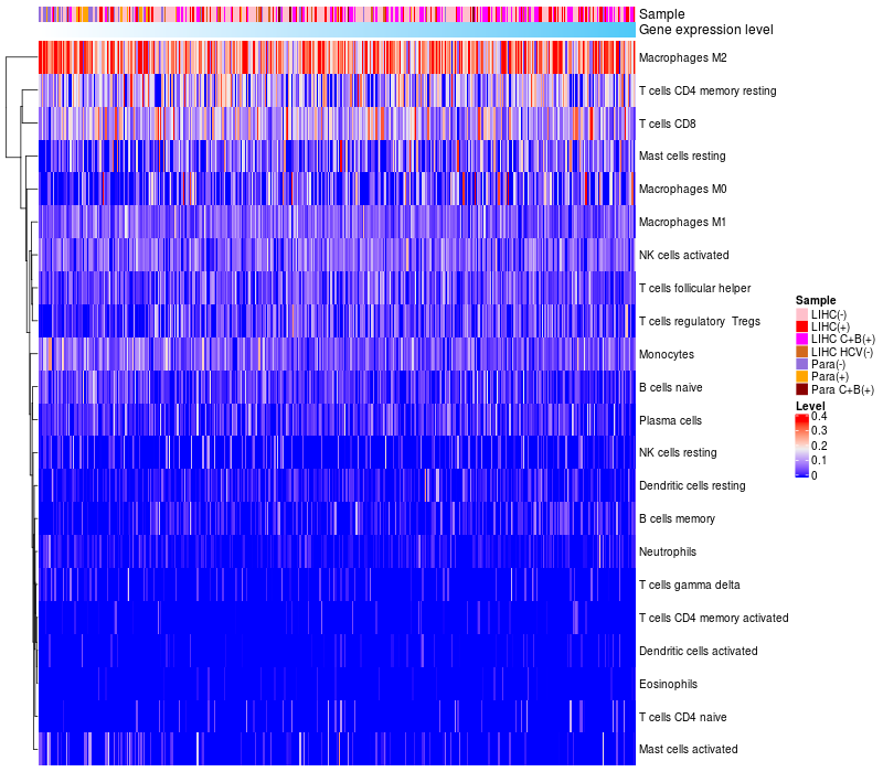 Liver hepatocellular carcinoma HCV (HBV+)(86), Liver hepatocellular carcinoma HCV (HBV-)(19), Liver hepatocellular carcinoma (HBV+)(209), Liver hepatocellular carcinoma (HBV+)(60), Paracancerous HCV (HBV+)(4), Paracancerous (HBV-)(28), Paracancerous (HBV+)(18) |