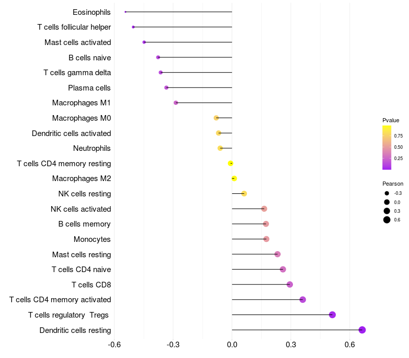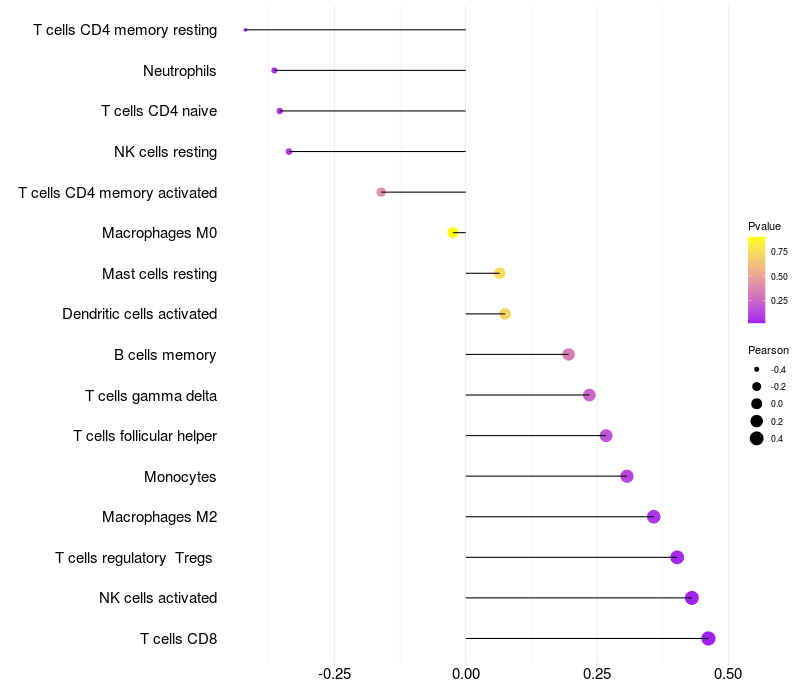 Lollipop of TRIM4 expression and immune infiltrating cell level correlation result in HTLV1+ samples