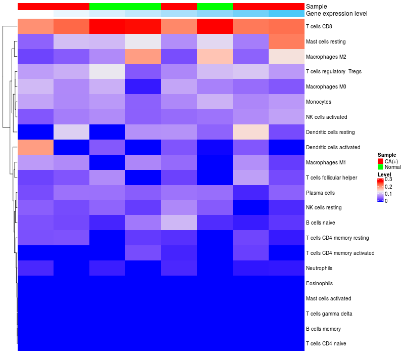 • Left: Heatmap of target gene expression and the level of various types of immune cells (cell type fractions) in all samples based on CIBERSORT method.