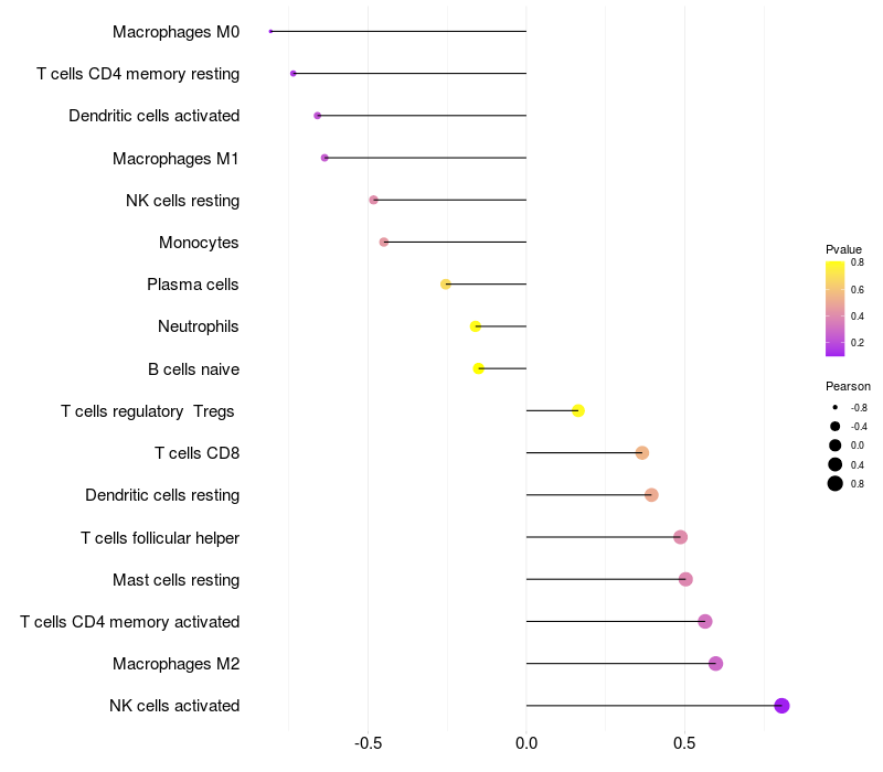 • Right: Correlation of target gene expression and the level of various types of immune cells in virus positive samples (Pearson Correlation Coefficient).