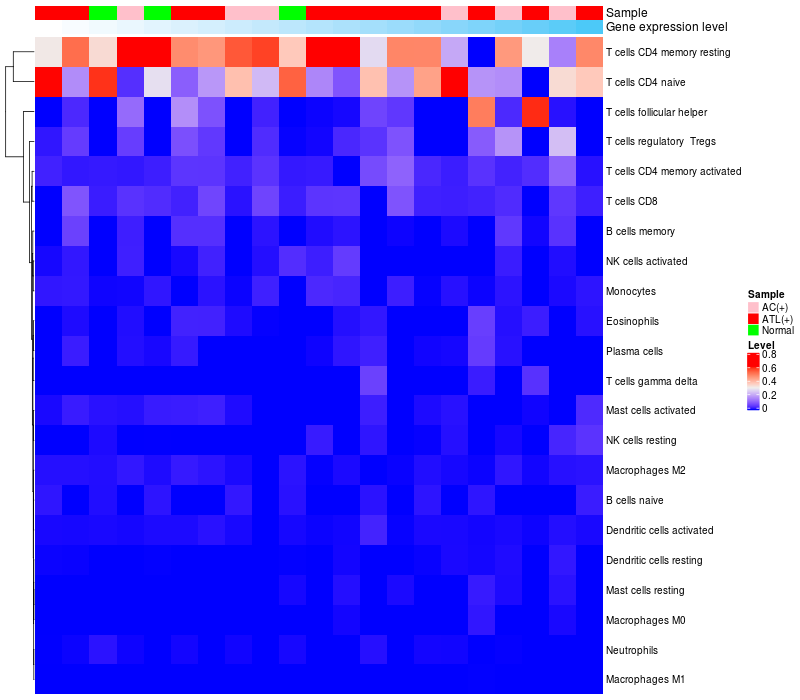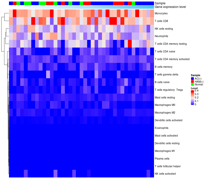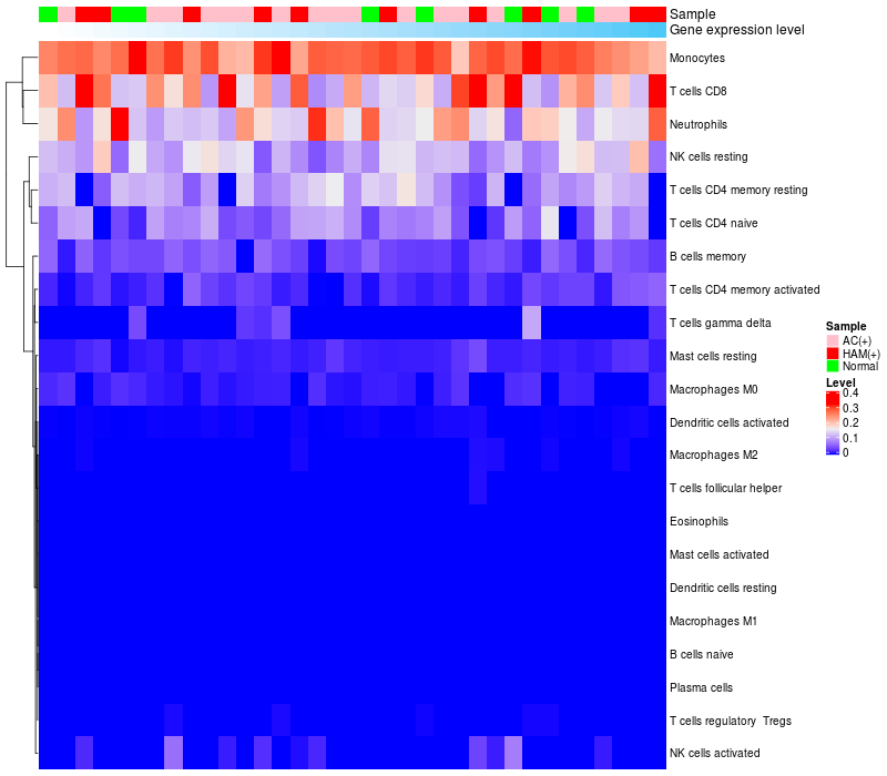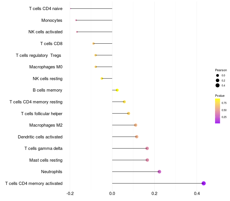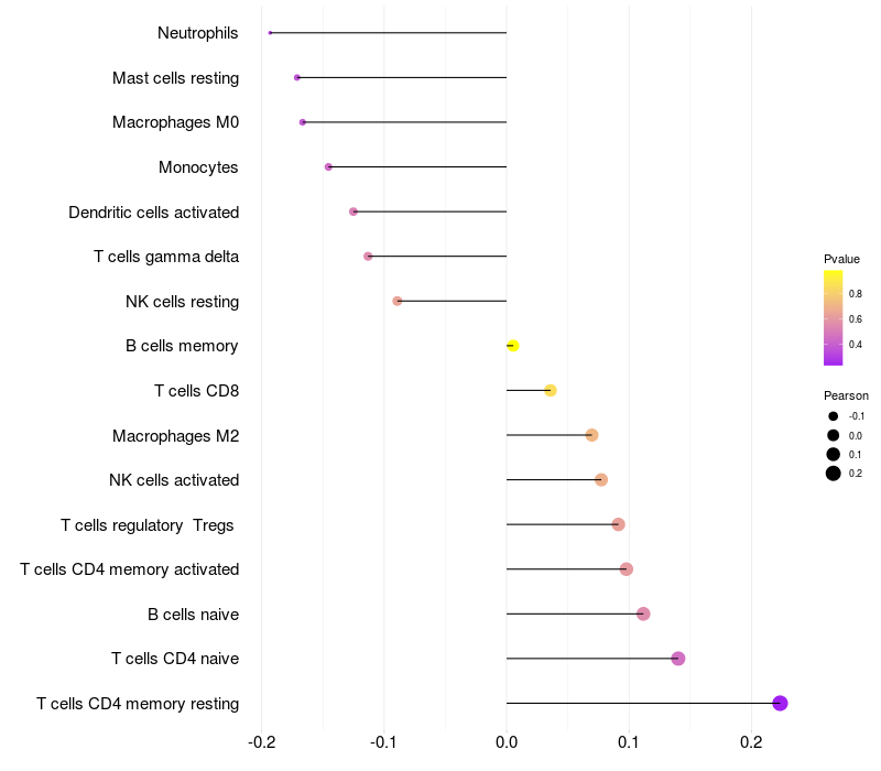 Lollipop of TRIM55 expression and immune infiltrating cell level correlation result in HTLV1+ samples