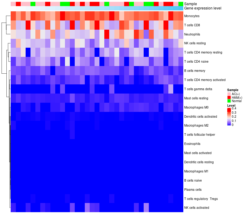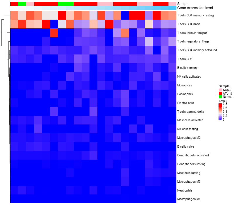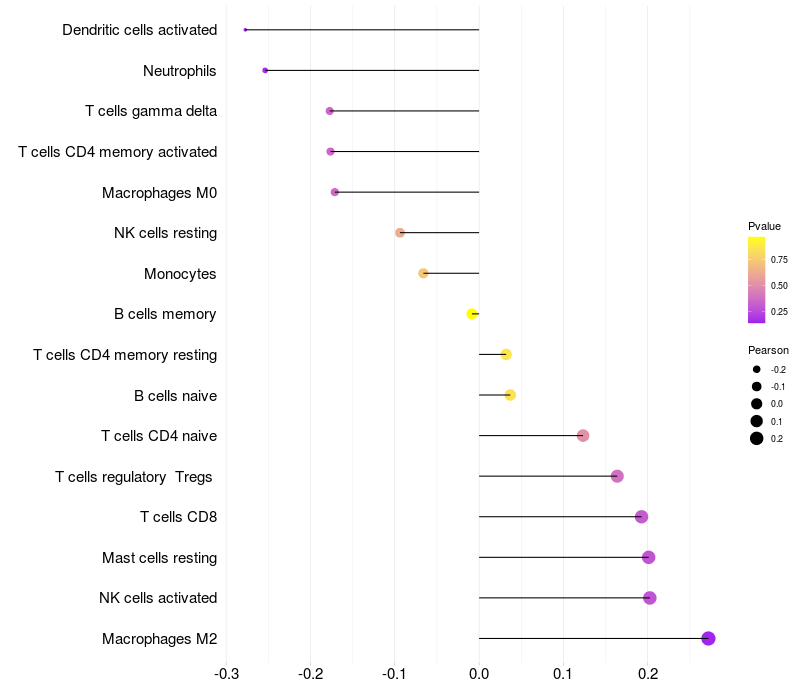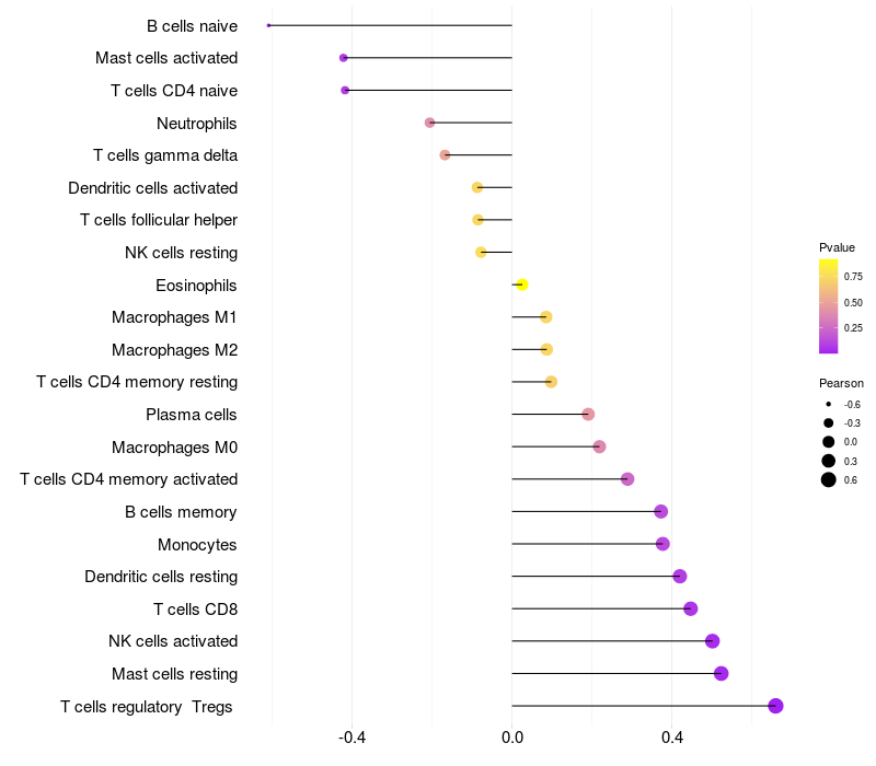 Lollipop of TRIM62 expression and immune infiltrating cell level correlation result in HTLV1+ samples