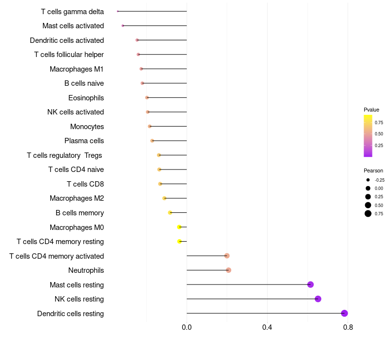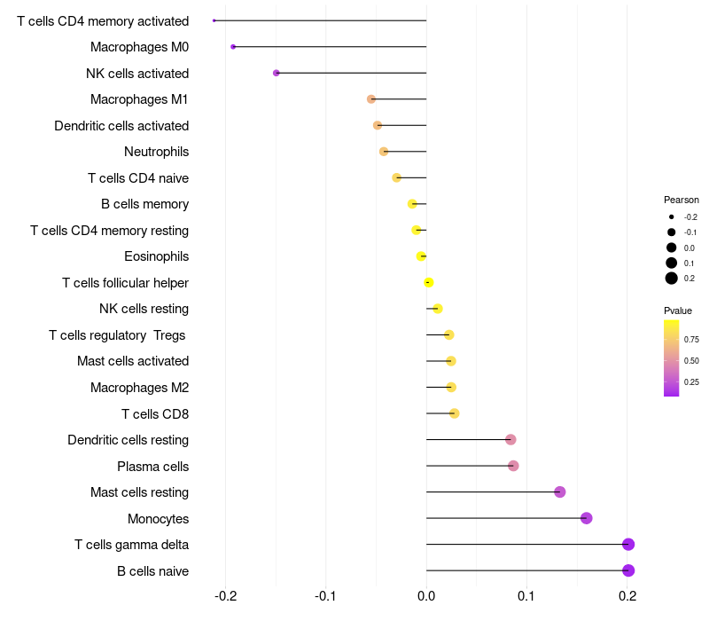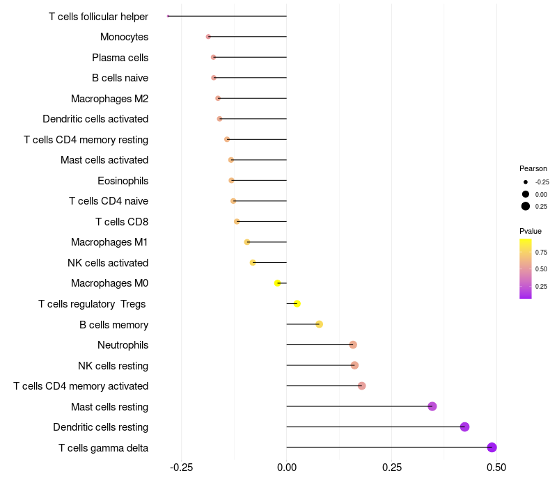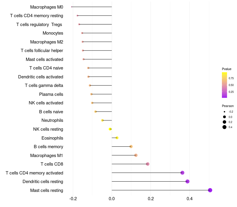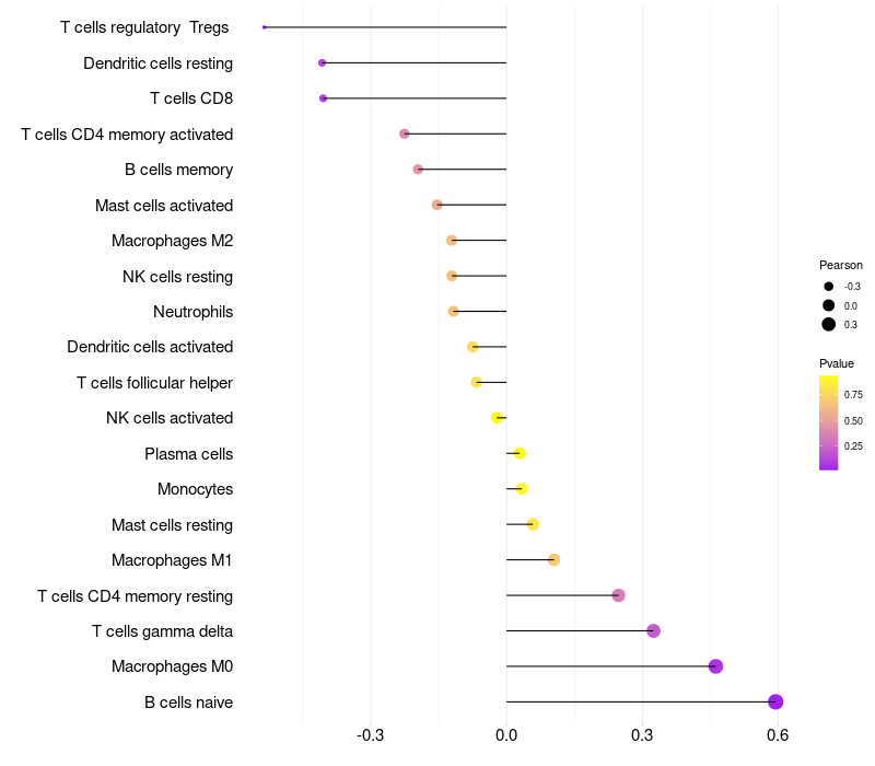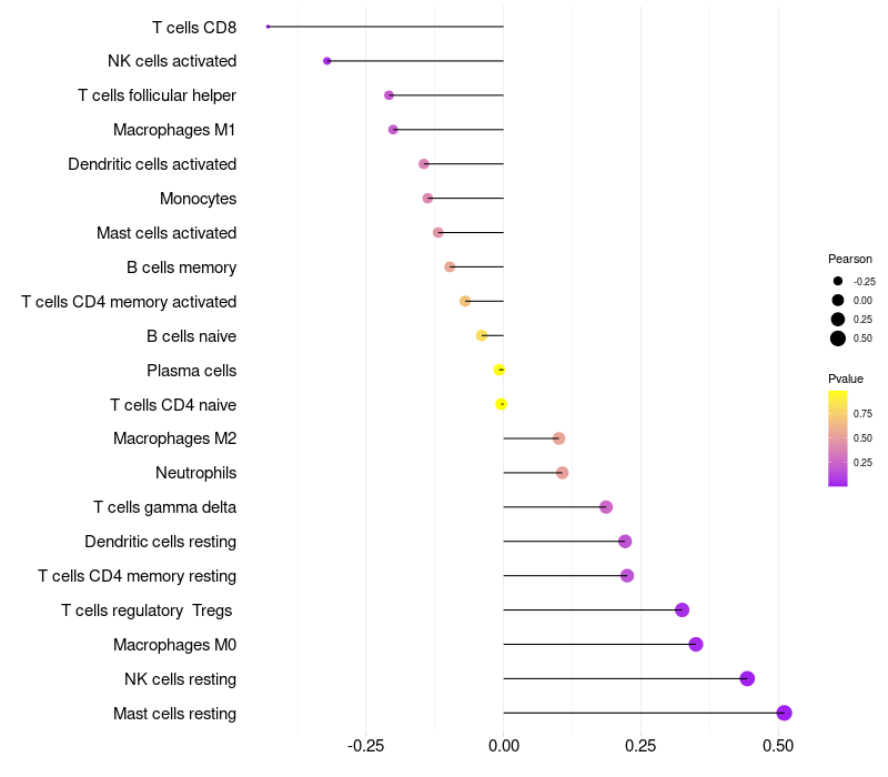 Lollipop of TRIM72 expression and immune infiltrating cell level correlation result in HPV+ samples