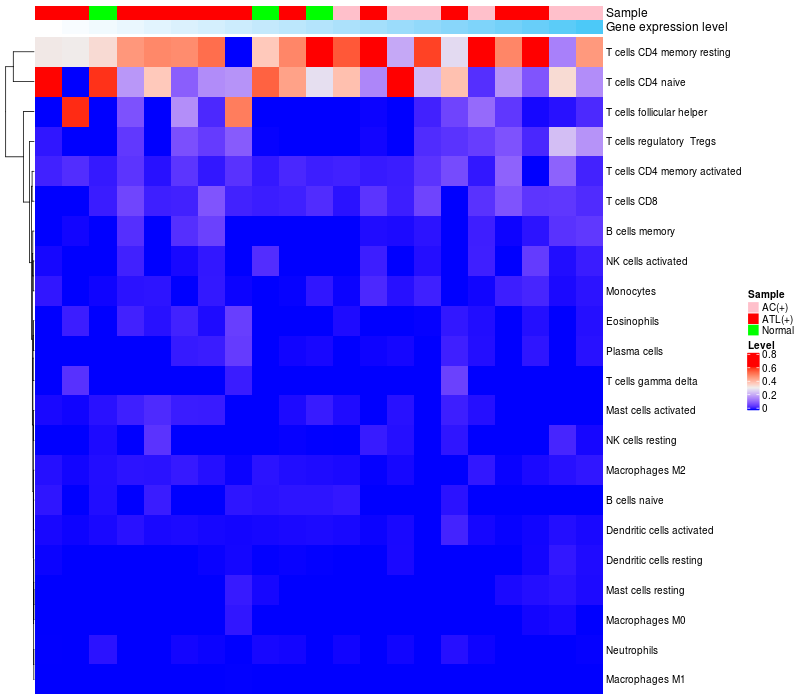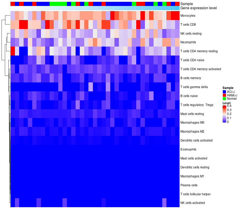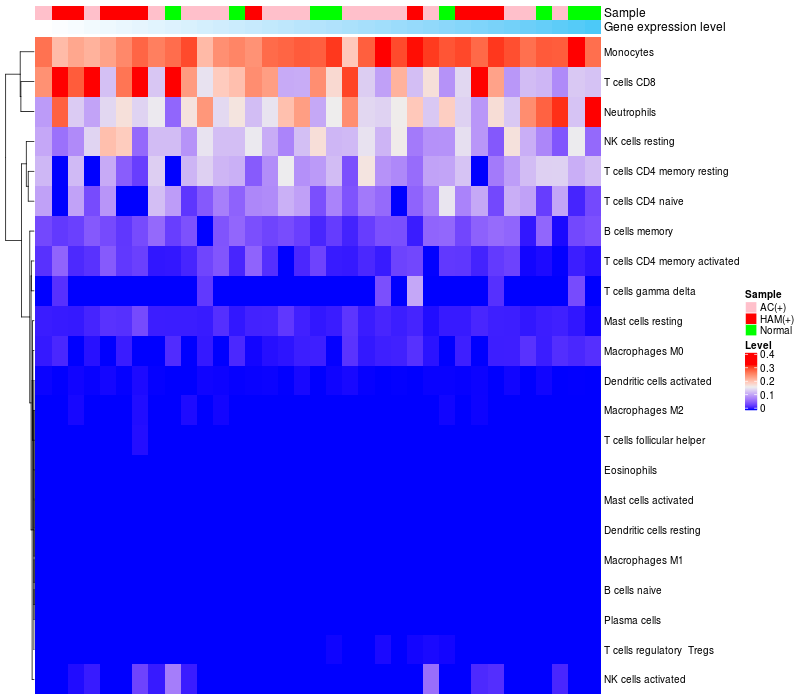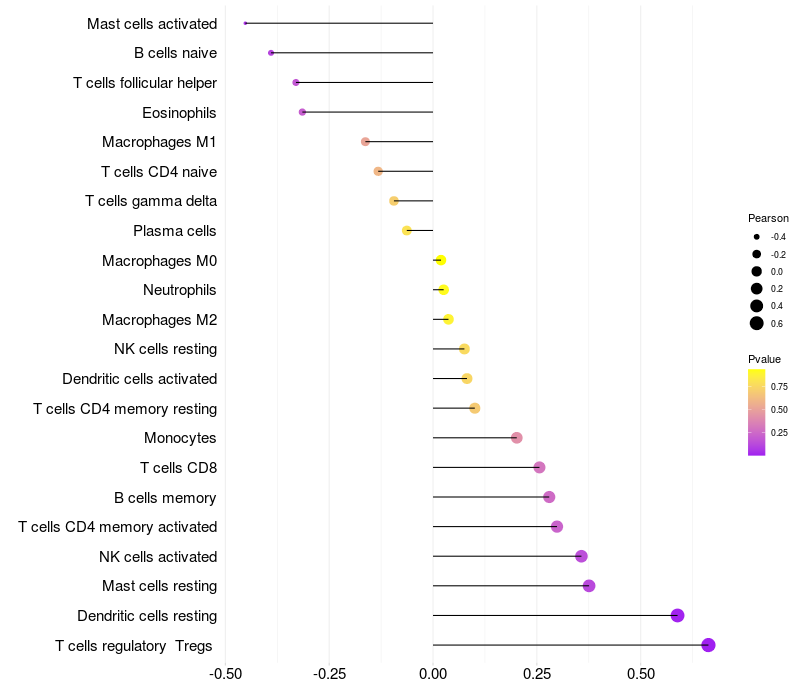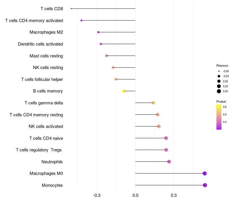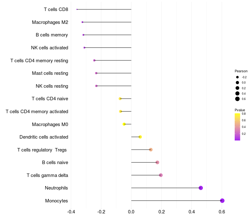 Lollipop of TRIM8 expression and immune infiltrating cell level correlation result in HTLV1+ samples